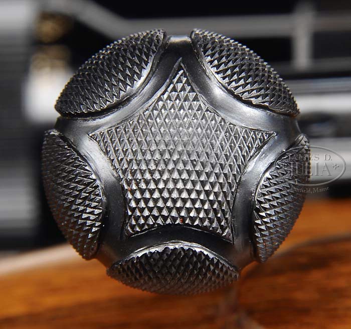 *SUPERB MAURICE OTTMAR CUSTOM MAUSER WITH SCOPE. SN 175734. Cal. 30-06. Double set triggers. Barrel and action are from a J. P. Sauer rifle w/ one third octagon to round fluted integral ribbed bbl w/ matted top, and is engraved “Mod. Mauser: J. P. Sauer & Son” on top w/ “30. U. S. G. 1906” on left side, and “M. Ottmar – Stockmaker” engraved on right. Breech end of bbl has gold line and is engraved “Fluid – Steel – Krupp, Essen”. Sauer SN “175734” is on right receiver ring w/ German proofs on left. Action has Lyman 35 bolt stop rear sight, and claw mount bases screwed to right rear and top of receiver ring. Bolt body and follower have been engine turned, bolt handle, blued w/ 5 nicely filed raised tear drop checkered panels, and 5 point star on bottom. Bolt shroud has inlaid gold line and has been case hardened. Top of safety has been checkered. Floor plate has lever release. Germanic style beautifully streaked Turkish walnut stock measures 14-1/2” over black “Decelerator” pad and features nicely sculpted shadow line cheek piece, vacant silver oval set into rounded end of pistol grip, raised side panels, double Schnabel tip, keyed forend, beautifully executed 22 LPI checkering w/ mullered borders, and case hardened trap on toe line containing a sub-caliber adapter. Weight: 7-1/2 lbs. Weight w/ scope: 8-1/2 lbs. SCOPE is Leupold Vari – x 2 – 1.5X to 5X w/ claw mounts which allow use of peep rear w/ scope attached. PROVENANCE: Dr. Frank Miller Collection. Letter from Hallowell and Co. discussing this rifle. Rifle magazine dated Sep/ Oct 1990 with article featuring this rifle. CONDITION: Excellent. Metal shows all of its rust blue, and other finishes, except for forend key escutcheons which are silvering. Wood retains virtually all of its finish w/ slight rubs and marks from handling w/ fairly deep ding on front portion of cheek piece. Bore is fine, w/ slight erosion in throat. SCOPE is fine, w/ small scratches in front of rear ring. Optics are clear. 4-35725 MGM137 (3,500-5,500)