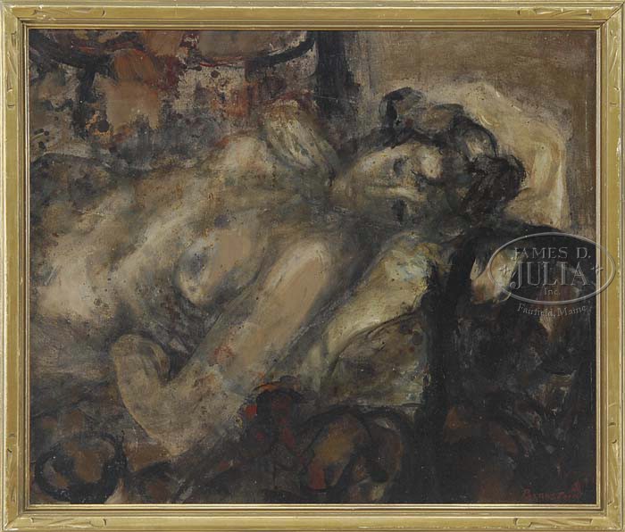 THERESA FERBER BERNSTEIN (American, 1890-2002) THE RECLINING NUDE. Oil on canvas on board interior view shows a nude woman reclining on a daybed. Signed lower right “Bernstein”. Housed in a carved wood gilt frame. SIZE: Sight: 21-1/2″ x 25-1/2″. CONDITION: Some restoration, discolored varnish layer. 9-24122 (3,000-5,000)