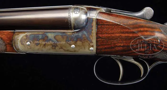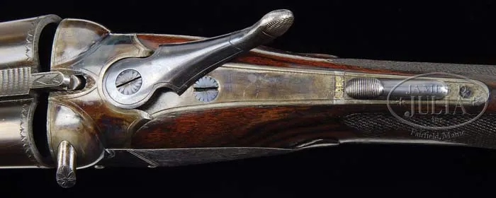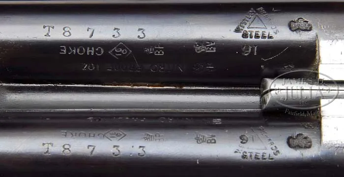 *WESTLEY RICHARDS BOXLOCK EJECTOR GAME GUN WITH CASE. SN T8733. Cal. 16 Ga. 2-1/2″ Chambers. 26″ Dovetailed bbls with matted concave game rib and crossbolt extension are engraved “Westley Richards. & Co.” and “London.” on tops. Bottoms of bbls are stamped with SN, “Westley Richards” triangle logo, and “Steel”, as well as, Birmingham nitro proofs for 1 oz. of shot. Case hardened boxlock action has Greener crossbolt with added bolting by top lever extension, double triggers, rounded bar, and automatic safety with “SAFE” inlaid in gold. Nicely marbled European walnut semi-pistol grip buttstock measures 14-1/4″ over checkered horn buttplate, and features drop points, and 22 LPI checkering with scalloped single line borders. There is a vacant silver oval on toe line. Matching splinter forend has horn tip, and Deeley release. Bore diameter: left -.623, right -.622. Bore restrictions: left -.045, right -.032. Wall thickness: left -.041, right -.031. Drop at heel: 2-3/4″, drop at comb: 1-9/16″. Weight: 5 lbs. 12 oz, LOP 14-1/4″. Brown canvas case with leather ends has olive green cloth interior, and contains pair of snap caps, and reproduction Westley Richards label. CONDITION: Excellent, as partially refinished. Bbls retain 98% of what appears to be original blue. Action retains 95% original case color, silvered toward bottom, with new lacquer. Floorplate and trigger guard have been re-blued, and retain virtually all of that blue. Top lever has most of its original blue, silvered at thumbpiece. Stocks retain most of all of an older rubbed oil finish. Checkering is slightly worn, and borders somewhat filled with finish. Action is tight. Bbls are on face. Ejectors are in time. Case is excellent. Original label has been removed. Reproduction Westley Richards label is excellent, as is interior cloth. A fast handling little gun. 4-39150 MGM30 (4,000-6,000)