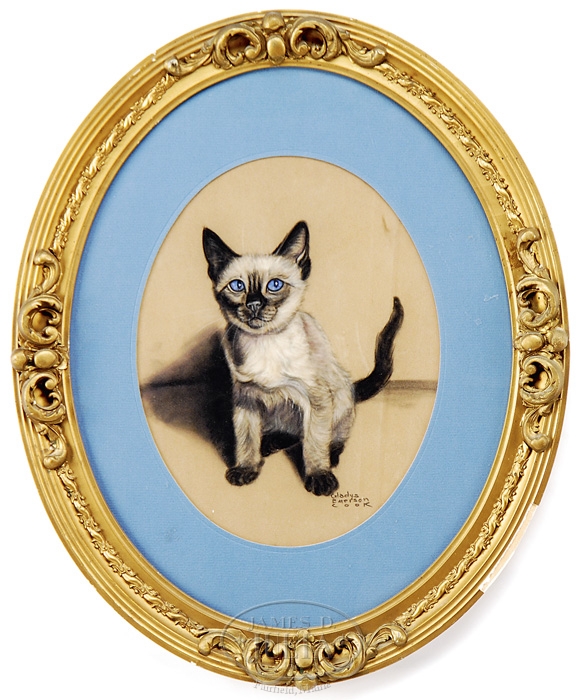 GLADYS EMERSON COOK (American, 1899-1976) BLUE-EYED KITTEN. Pastel portrait of a seated cat looking straight at viewer, white and gray color with bright blue eyes. Housed in an antique oval frame with blue mat. SIZE: 13-1/2″ h x10-1/2″w. CONDITION: Very good. 9-96348 (200-400)