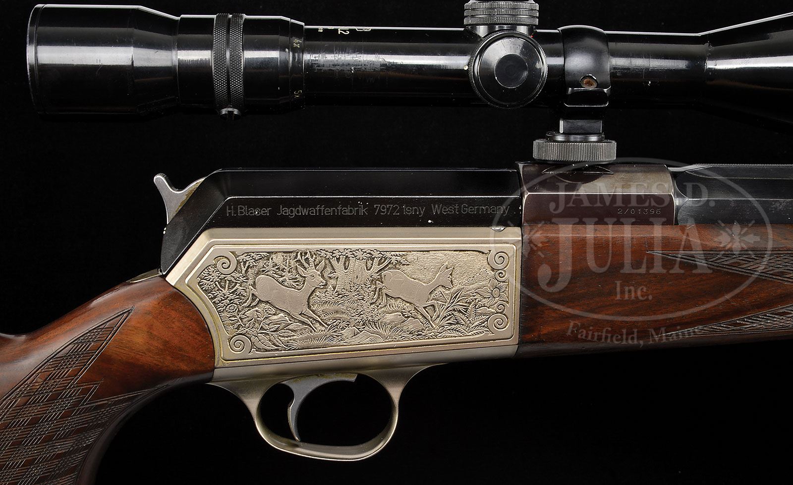 *LEFT HAND BLASER SR 830 (CALLED ULTIMATE IN USA) MODULAR RIFLE WITH SCOPE. SN 00971. (Stamped on left front of action under forend.) Cal. 30-06. 24″ Octagon to round bbl with integral quarter rib, is mounted with single standing square notch rear sight, and base for Blaser special scope mounts. Rear portion of bbl is stamped with model, caliber, and assembly number. Left hand bolt assembly is stamped with Blaser name and address on right side. Coin finished action has side panels engraved with game scenes in appropriate backgrounds; a bugling stag and alert hind in alpine meadow on left side, and a buck and doe roebuck bound through woodlands on right. Dense European walnut full capped pistol grip stock has skip line checkering at grip, and features left hand Bavarian style cheekpiece. Matching forend has schnabeled tip. Drop at heel: approx 2-1/2″, drop at comb: approx 1-15/16″. Weight without scope: 7 lbs. 4 oz. LOP: 14″. Kahles Helia 39L2 scope with 3 post and crosshair reticle is in Blaser QD rings. CONDITION: Excellent. Bbl retains 95% of its orig blue with some slight silvering and light scratches. Action retains nearly all of its coin finish. Bolt has some slight scratches and marks in its anodized finish, mostly at rear. Stocks retain nearly all of their orig finish with some spotting and minor marks. Bore is excellent. Action is smooth. Scope has a number of scuffs and ring marks in its lacquer finish. Optics are clear. 4-48915 MGM220 (1,000-1,500)