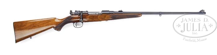 *HOLLAND AND HOLLAND TAKE DOWN MAGAZINE RIFLE. SN 569. Cal. 240 Apex. 23.5″ Barrel is engraved “Holland & Holland, 98, New Bond St., London.” on top. Breech end of bbl is engraved “Holland’s .240 Bore Apex Super Express Rifle”. Barrel shank also has London nitro proofs for 240. In addition the top of the bbl is engraved “Walter Locke & Co. Ltd Calcutta, Lahore & Delhi”. Bbl is fitted with rear sight base with one standing, one folding express sight marked for 50, 200, and 350 yards. Silver bead front sight is longitudinally dovetailed into tall sight base with Holland and Holland style folding sight hood. Sling eye is on a band around bbl. Mauser 98 action is stamped with Holland SN “569”. Top of receiver ring is stippled and has London view proof. Bolt handle is bent in typical Holland style with matching SN and proof. Holland and Holland style cocking piece peep sight is also installed. Wing safety has “Safe” inlaid in gold. Rifle takes down by removing large screw through front of trigger guard, pulling upward on the bbl, removes bbl and action from the stock. Rear of action is held in place by retaining hook. Full fiddle back figured and lightly streaked European walnut stock measures 14-1/2″ over ribbed horn butt plate, and features right hand cheek piece, sling eye, vacant silver oval, trap steel grip cap (containing a spare front sight), and 20 LPI point pattern checkering with mullered borders. With rifle are eight 20 Round boxes of relatively new H and H cartridges and 4 boxes of Kynoch. PROVENANCE: Copy of Holland and Holland ledger page supporting most all features and giving completion date of 1921. CONDITION: Very good. Metal retains most of an old re-black. Stock has been refinished with lacquer or varnish and is quite shiny. Checkering has been re-cut. Bore is bright and shiny, but with slight erosion at throat. 60% Bright blue remains on bolt stop and cocking piece. 4-37623 MGM25 (5,000-7,000)