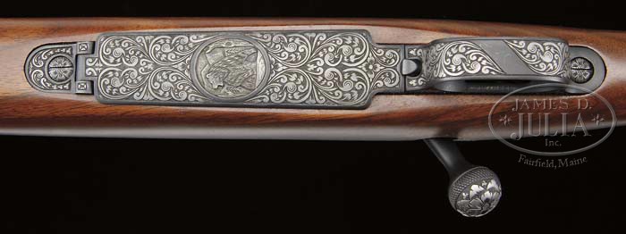 *KEN WARREN ENGRAVED WINCHESTER MODEL 70 CLASSIC. SN G70624. Cal. .375 H & H MAG, 24″ rnd bbl, matted front ramp with fine bead sight and hood, island flip-up rear sight. Left side bbl is marked “WINCHESTER MODEL 70 375 H&H MAG. / MADE IN NEW HAVEN. CT U.S.A.” Right side “CLASSIC SM”. Muzzle of bbl has 1-1/2″ wedge of bold foliate scroll and small triangular wedge behind ramp. Island rear sight has wedge of bold foliate scroll in front and behind. Each side of bbl has 3″ wedge of bold foliate scroll. The pre-64 style, control rnd feed action is marked on left side “WINCHESTER / TRADEMARK” and topped with Talley-style scope bases. The entire receiver is engraved with bold foliate scrolls as well as rear tang, bolt shroud, shank of bolt handle with bottom of bolt handle a bursting floral design. Trigger guard and floorplate are fully engraved with bold foliate scroll, circle in center of floorplate a relieved snarling bear with turned head with mountainous background. Inside right of trigger guard is signed “K.W. WARREN”. Mounted in uncheckered nicely figured American walnut, straight comb with left side cheek piece, Boyds 1/2″ solid black recoil pad, sling swivel studs with white spacer, sculpted metal grip cap polished and ready for engraving. Accompanied with orig Winchester cardboard box. CONDITION: Extremely Fine. Gun appears new and test-fired only. Metal surfaces retain their orig matte blue finish except for engraving that has been French grayed. Stock is sound with a few minor handling marks retaining virtually all of its orig finish. Metal grip cap will require a little work for a proper fit. Mechanics are crisp with bright shiny bore as gun appears to be test-fired only. Orig box is fine and includes paperwork. 4-40982 BDT243 (1,750-2,750)