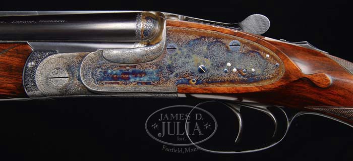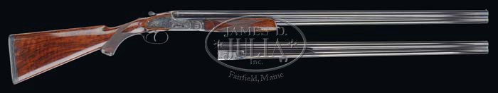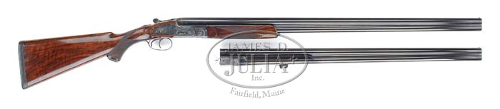 *SUPERB AND UNUSUAL 20 BORE JAMES WOODWARD BEST QUALITY OVER AND UNDER WITH 2 SETS OF BARRELS AND ORIGINAL CASE. SN 6860. Cal. 20ga. Double Triggers. Automatic ejectors completed Nov. 1928 for Robert Tucker. Set number 1: 28″ Steel bbls w/ flat solid file cut rib are marked on the top barrel “James Woodward & Sons. 64. St.James’s Street. London.” on the left side, and have British provisional and definitive nitro proofs for 2-3/4″ chambers on the right. Bottom barrel has proofs on the locking area as well as SN “6860”. Barrel set no. 2 has the same specifications as set 1, except that they are 32″ long, and are marked with SN “6866.” (Very often a second set of bbls is given a separate SN – factory correspondence states that these barrels were fitted in Nov. 1928, numbered 6866, 32″, 2-3/4″ chambers, chokes full both “for duck shooting”). The sleek small size bolstered action and side locks have very nicely executed rose and scroll engraving w/ “Woodward’s Patent Under & Over” engraved on the bottom of the action and “J.Woodward & Sons.” engraved on the lock plates. “Safe” is inlaid in gold in front of the typical Woodward T-shaped safety. Tumbler ends have gold line cocking indicators. Trigger guard is scroll engraved and shows SN “6860” on the grip. Slightly figured and streaked full pistol grip European walnut buttstock measures 15-1/4″ over a leather covered pad and has tear shaped drop points, horn grip cap, and individual initials “JT” inlet in gold on the toe line. Checkering is 28 LPI w/ mullered borders. Forend has Anson release with wood and checkering to match buttstock. Set 1 (28″): Bore diameter: top -.619, bottom -.618. Bore restrictions: top -.016, bottom -.008. Wall thickness: top -.024, bottom -.024. Weight: 6 lbs 5.1oz. Set 2 (32″): Bore diameter: top -.618, bottom -.619. Bore restrictions: top -.033, bottom -.015. Wall thickness: top -.022, bottom -.024. Drop at heel: 2-3/8″, drop at comb: 1-1/2″. Weight:6 lbs 7.6oz. Original oak and leather case w/ brass corners with initials “N.R.T.” and “Burlingame” on the lid. Interior is lined in scarlet baize w/ James Woodward & Sons label and notes from the manufacturer on care of gun. Accessories include 2 tins of cleaning fluids w/ Woodward labels, horn handled chamber brush, Horn handled turn screw marked “Woodward & Sons,” horn striker block, 2 A&F Co snap caps, striker case marked SN “6860” w/ spare strikers, old tube of Vaseline, leather wallet w/ pull through cleaner, cleaning brush and mop. PROVENANCE: Factory fax giving original specifications of gun and extra barrels. CONDITION: Very fine as refinished. Both sets of bbls retain 98% of very high quality London re-black w/ a few minor wear marks. Bores are excellent, bright and shiny w/ no visible imperfections. Action retains 80-90% London quality case color, silvering on action beads, and bolsters. Bright blue on trunnion pins mostly silver. Lock plates retain 98% bright color. Trigger guard and top lever retain 90%+ blue. The buttstock retains 98% of a hand rubbed oil finish. Checkering is clean w/ very slight wear. Forend has finish to match, forend iron silvered on lower right and left sides. Forend tip is 50% silvered. Action is tight and on face w/ both sets of bbls. Ejectors are in time. Case: Leather is smooth and in good condition, straps are replacements, handle is good. Interior partitions are tight. Cloth is slightly dirty from use. Accessories are in good condition, except the snap caps which are very well used. A truly wonderful gun … one couldn’t ask for much more! 4-35078 MGM20 (125,000-150,000)