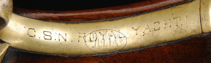 COLT NAVY CARRIED BY CAPTAIN THOMAS CHUBB OF THE CONFEDERATE SCHOONER ROYAL YACHT. SN 23167. This wonderful condition model 1851 Colt Navy was recently found in the state of Vermont where Chubb died at his summer home in 1886. Chubb’s son had a business of manufacturing fishing rods and reels with the Thomas H. Chubb brand, which are highly collectible today. This business was near Chubb’s summer home in Post Mills, Vermont. The commemorative inscription on backstrap of gun reads “CAPT T. H. CHUBB, 1861-1865” and “CSN ROYAL YACHT” back of triggerguard. Accompanying this gun is a large folio of history which tells us more than has been published in texts on the Confederate Navy. Thomas Moebs, in his definitive Confederate Navy volume, knows little of Chubb’s life or service, though his record on the Royal Yacht and his exchange from Ft. LaFayette are mentioned. From the attached records; Chubb is listed as being Commodore “born in 1811 of good old Revolutionary stock and within the very shadow of the Bunker Hill Monument where his parents and grandparents lived”. Chubb in his 80th year “was one of the most sprightly participants in the Bunker Hill celebration which took place on June 17, 1890”. Thomas Chubb had a long history with the sea and various navies. “Mr. Chubb left his Puritan Home when a mere boy, contrary to the wishes of his parents, and engaged as cabin boy on a coasting schooner, next on board of a man of war, and was soon a full fledged seamen. When the United States squadron was ordered to the Mediterranean in 1827, Chubb was numbered among the crew of the flagship JAVA under the command of Commodore Crane. A call for volunteers to man the US schooner PORPOISE against the Greek Pirates that were preying upon American merchant men in the Mediterranean was responded to by Chubb. The cruise offered sufficient site of bloodshed and carnage to fully appease the young man’s desire for naval combat. In 1838, Captain Chubb, then in the very prime of manhood and abundantly supplied with wealth, became so earnestly aroused in behalf of the Texans in their struggle for independence that he loaded the Brigg, CECELIA, with munitions of war and sailed for Texas In 1839 he established a head-right in Texas, his family joining him the same year coming from Massachusetts. He was appointed superintendent of public construction by Sam Houston (who was a warm friend of the Captains) He continued in this service until the outbreak of the Civil War, when the association’s pilot boats were all captured by the blockading fleet, excepting the Royal Yacht. Though an Eastern man by birth and education, he was a Southern man by adoption and inclination; at the secession of his state he took up arms in defense of his rights and his property with the same determination that characterized his whole life. He was one of the first men afloat in the Confederate Navy, and his vessel, the ROYAL YACHT played an important part through the entire war”. Captain Chubb was involved in the capture of the federal steamer STAR OF THE WEST which was taken as a prize and sent to New Orleans. The Royal Yacht was commissioned on the 9th of September 1861 and was attacked by the enemy on the eighth day of November following. This attack, near Galveston, from the USS Santee overwhelmed Captain Chubb 100 U.S sailors to 13 aboard the ROYAL YACHT. When the attack was first made, there were only two men on the deck, one of whom was slightly wounded. The noise of the attack soon brought Captain Chubb and Captain William Saunders to the deck and they alone stood combating against a hundred men. The fight was a desperate one and lasted until all the means of defense on the YACHT were exhausted. Their shots had told with effect on the enemy, killing seven of them, and wounding eight others, some mortally”. Captain Chubb was placed on the Santee, transported to New York where he and his men were marched in irons through the streets…. they were afterward sent to Fort Lafayette….. Chubb was later exchanged….” and upon arriving in Texas he was met by any most cheering reception by the citizens of Houston and was asked to tell the story of his capture and confinement…..Upon reaching Galveston…. was lionized as hero of one of the most gallant fights of the war. It was this engagement that gave Jewett his promotion and cost the warmest friendship between Admiral Jewett and Commodore Chubb. Commodore Chubb continued in the fight as long as there was a ray of hope left, and contributed freely of his ample means. But when Lee surrendered he was among the first to step back to the old standard of the Stars & Stripes….. soon after the close of the war he was appointed by Mayor Bolton and Alderman of the city of Galveston to the office of harbor master at the port of Galveston which office he held until his death” at his summer home in Vermont. Chubb is buried in Galveston, Texas. CONDITION: This gun is mechanically fine, tight with sharp edges in as found condition. Gun overall is gray with scattered pitting over 20 or 30% bright blue on bbl. Cyl scene is complete but with scattered pitting. Backstrap and triggerguard retained a portion of their silver-plate. Stocks are very good with much orig varnish, a small chip is present on inside toe of left stock. 4-32838 JS352 (10,000-20,000)