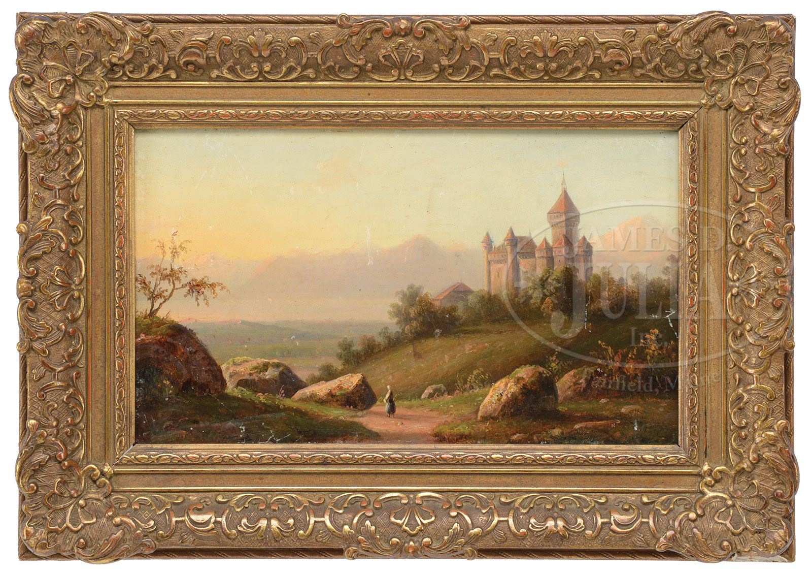 JOHANNES FRANCISCUS CHRIST (Dutch, 1790-1845) CASTLE IN LANDSCAPE. Oil on panel Housed in a gesso decorated gilt frame, in good condition, with some minor losses Signed “J.F. Christ”, lower right SIZE: 6-3/4″ x 11-1/4″. Overall: 11″ x 15-1/2″. CONDITION: some light scratches to surface, minor inpainting, otherwise very good. 9-27734 (2,000-4,000)
