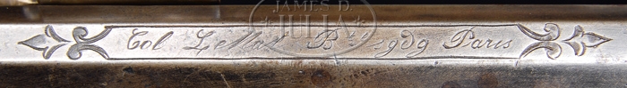 SCARCE TRANSITION FIRST MODEL PARIS LEMAT. SN 663. Cal. 10.6 mm/16 ga. Usual configuration with 6-3/4″ oct bbl, dovetail brass front sight, engraved on top flat “COL. LeMat Bte sgdg Paris”. It has rammer mounted to left side as with 2nd models. It has usual 9-shot cylinder. Smoothbore bbl is about 6-5/8″ threaded on the head for bbl boss attached to oct bbl. It has spring loaded bayonet, latch with spur trigger guard, 2-pc checkered walnut grips & a swiveling stud & lanyard ring in butt. Hammer nose is articulated with a rounded short stud from each side. These grapeshot revolvers were a favorite of the Confederate Cavalry and saw extensive use throughout Civil War. CONDITION: Good to very good, all matching including grips. Overall retains a smooth medium brown patina with some very fine pitting at muzzle end of bbl & on cylinder. Bbl slip ring, at cylinder end, shows welding repairs with some alteration on rammer pivot, which may be an old replacement. Oct bbl also shows some artificial aging. Grips are sound showing heavy wear. Mechanics are fine, strong dark rifle bore, lightly pitting smoothbore. 4-32945 JR335 (17,500-27,500)