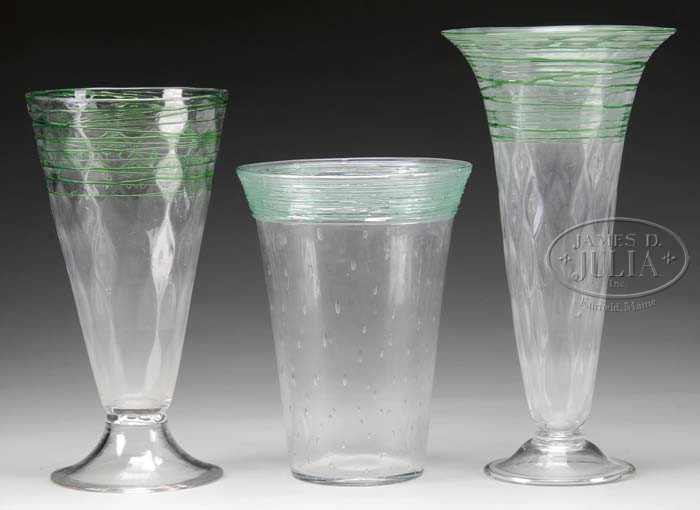 THREE STEUBEN GREEN THREADED VASES. Lot consists of a footed trumpet vase in dq pattern, a footed funnel vase in a dq pattern and a flip vase with controlled bubbles. All pieces are decorated with green threading and are all signed with acid etched Steuben fleur de lis. SIZE: Ranges from 9-3/4″ to 13-3/4″ t. CONDITION: Very good to excellent. 5-61663 (200-400)