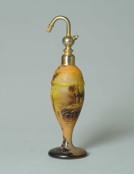 SIGNED ENAMELED ATOMIZER. Clear glass atomizer is completely enameled in yellow shading to salmon with a scene of a farmhouse, lake with boat and trees. Signed on foot “Auzies”. Atomizer is topped with gold colored atomizer head. SIZE: 9″ t. CONDITION: Missing atomizer ball and cord, otherwise very good. 5-70038 (250-350)