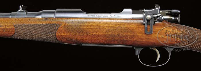 *CLASSIC MANNLICHER SCHOENAUER M1910 TAKEDOWN CARBINE. SN 6514. Cal. 9.5 X 57 MS. 20″ Round barrel. Standard one standing one folding leaf rear sight marked for 300 yards, is transversely dovetailed through sweated-on block and ring. Original German silver bead steel base front sight is dovetailed through standard front matted ramp. Right rear of bbl is stamped with SN. Bottom of bbl and action have Vienna proofs for 1920. Action with Schoenauer rotary magazine is marked “Patent Mannlicher Schoenauer M.1910” on matted receiver ring. Left side of action is stamped “Oesterr. Waffenfabr. – Ges. Steyr”. Action features single double pull trigger and Lyman no. 36 receiver sight with swinging aperture mounted on bolt stop. Bolt has typical “butter knife” handle, and matching SN is stamped on bottom. Plain light European walnut stock measures 14-3/4″ over original serrated steel trap buttplate. Trap covers original rubber well liner with three openings; two for cartridges and another for cleaning rod. Original cleaning rod is present. Stock is checkered at 18 LPI with scalloped borderless checkering at forend. Point pattern grip checkering has line border at rear, and three line border on points. Action takes down from stock by removing front pin with detent, magazine, and moving lever mounted in trigger guard, which allows barreled action to be lifted out. Stock also features sling loops, horn grip cap, and cheek piece for right handed shooter. Stock is stamped “33161” on toe line and “Made in Austria” in front of magazine. Included with rifle is an unmarked tan leather carrying scabbard with two compartments, one for barreled action, and one for the stock. Handle is fixed to top with copper rivets through brass washers. Also included is an old box of DWM 9.5 x 57 cartridges in stripper clips. PROVENANCE: Ammo and scabbard. CONDITION: Excellent. Barrel and action retain 90 – 95% original blue, silvering on high edges and at muzzle. Magazine floorplate retains 40 – 50% original blue, the remainder silver to pewter gray. Stock retains most of its original varnish finish with a number of marks and scuffs from handling and use. Bore is excellent, bright and shiny, near mint. Scabbard is very fine with handle and straps intact, but with numerous rubs. Cartridge box has been opened, and label is somewhat soiled and lifted. This is a nice, clean little carbine in a great caliber, easy to load for with .375 diameter bullets readily available. 4-40460 MGM1 (3,000-5,000)