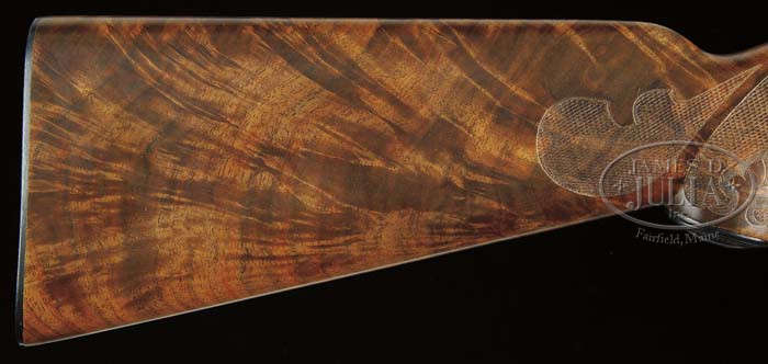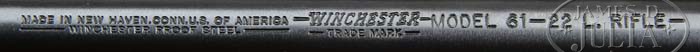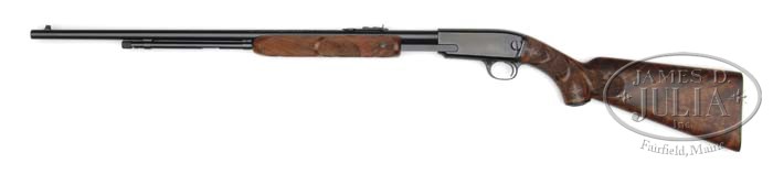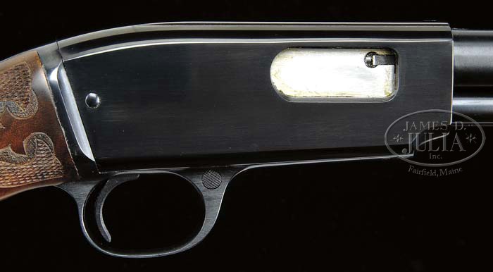 SPECIAL NOTE: As the cataloguer correctly noted, this Winchester is a “custom” gun – not to be confused with a Winchester produced in the Winchester “Custom Shop”. Also, the box and hang tags associated with this lot are replicas. *CUSTOM WINCHESTER MODEL 61 DELUXE B-CARVED WITH BOX. SN 235721. Cal 22 Long Rifle. 24″ rnd bbl, dovetail fine bead sight, 32-B rear sight with elevator. Left side of bbl marked “MADE IN NEW HAVEN.CONN. U.S. OF AMERICA/WINCHESTER PROOF STEEL-WINCHESTER/TRADEMARK-MODEL 61-22 L.RIFLE”. Proof marks can be found top and adjacent receiver. Later grooved top receiver, mounted with select grade walnut, B-carved pistol grip, Winchester hard rubber grip cap, checkered steel buttplate, and B-carved forend. Gun is accompanied by tan, red letter box, yellow & white end label, stamped “SPECIAL DELUXE SELECT WOOD”, and hand written “B-CARVING”. Box is marked on bottom “A1017-H32”, “BIRD & SON INC.” in red, and a Model 61 hanging tag stamped “SPECIAL DELUXE SELECT WOOD”. CONDITION: Extremely fine as gun has appearance of being test fired only. Box is in fine condition with some minor tattering in corners. 4-41050 BDT30 (4,000-6,000)