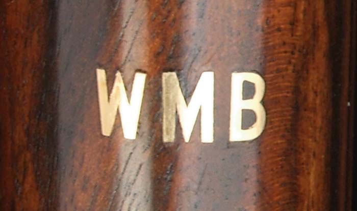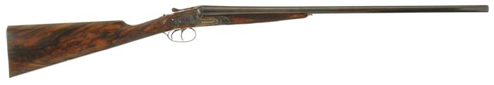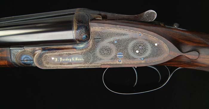 *SCARCE CASED PURDEY DBL BBL SHOTGUN. Cal. 20 ga. SN 28945. Spectacular little dbl with 26” bbls choked MOD/IMP-CYL with swamped, smooth, tapered, concave rib, sgl bead, dbl chopper lumps, ejectors, assisted opening & dbl triggers. Mounted with exhibition quality, hand-selected French walnut with checkered splinter forearm and straight hand stock with raised teardrop side panels, 16” over a checkered butt. Bottom of stock is inlaid with block letter initials “WMB” (the initials of the orig owner). Receiver is beautifully engraved in typical Purdey patterns of beautiful, extremely fine, English rose & scroll patterns with maker’s name in Old English script in gold on each lockplate. Maker’s name & address is in block letters in gold on bottom and in Old English script on the bbls. Accompanied by a large packet of correspondence between Purdey’s & the orig owner detailing the entire order for this shotgun beginning in June 1985 until delivery in March of 1989. Also accompanied by its orig English, burgundy leather & oak, burgundy felt lined casing compartmented for the shotgun, a pair of Purdey snap caps, a rnd pewter oil bottle, a 2-pc wood, brass & aluminum cleaning rod, a stuck shell extractor, a small nickeled parts bottle containing two new spare firing pins & a covered compartment containing a bore brush & mop. It has maker’s label & specification card inside the lid. Bore diameter: left – .615, right – .614. Bore restrictions: left – .020, right – .012. Wall thickness: left – .035, right – .037. Drop at heel: 1-1/2”, drop at comb: 1-1/4”. Weight: 5 lbs. 10.88 oz. CONDITION: Extremely fine, as new, appears to be unfired (and according to the orig owner, he never fired it). Retains all of its brilliant, orig, factory finish to both metal & wood. Stock is sound with a few minor handling & storage marks. Mechanics are crisp, brilliant shiny bores. 4-31161 JR450 (45,000-60,000)