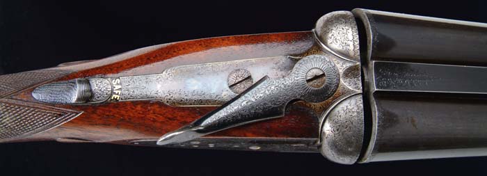 *CASED H.J. HUSSEY IMPERIAL EJECTOR DOUBLE BARREL SHOTGUN. Cal. 12 ga. SN 14134. Beautiful sidelock double with 28-1/4” steel bbls choked MOD/IMP-CYL with smooth, concave, tapered rib, sgl ivory bead, dbl underbites, ejectors & dbl triggers. Mounted with very nicely figured, checkered English walnut with splinter forearm & straight hand stock, 14-1/4” over a half-checkered, hard rubber buttplate. Receiver & lockplates are beautifully engraved with fine English rose & scroll patterns, having about 90% coverage. Lockplates each have a large bouquet of flowers with other blossoms on bottom. Each lockplate has maker’s name “H.J. HUSSEY LTD” and gold line cocked indicators. Bottom is marked with the model. Accompanied by its orig red felt lined, oak & leather casing embossed in a panel on the lid “T.P. BROOKS” and it has orig maker’s label inside lid along with an instruction card. Compartmented in bottom for shotgun, a 2-pc brass & ebony cleaning rod, a pair of W. Cashmore brass snap caps, a rnd nickel oil bottle, a Tomlinson cleaner, a covered compartment with a rnd nickled parts bottle containing a pair of spare firing pins and cleaning tools. A large, uncovered compartment is empty. Bore diameter: left – .730, right – .730. Bore restrictions: left – .014, right – .002. Wall thickness: left – .025, right – .023. Drop at heel: 2-1/2”, drop at comb: 1-1/2”. Weight: 6 lbs. 8.96 oz. CONDITION: Fine to very fine. Bbls retain 85-90% orig blue turning slightly plum, thin over forearm area with some light rust around muzzles. Lockplates retain most of their orig case colors, somewhat faded with receiver retaining about 80-85% faded orig case colors. Wood is sound with minor nicks & scratches and retains most of its orig oil finish showing light to moderate wear on stock with dark oil staining on forearm. Stock may have been cleaned a long time ago. Mechanics are fine, bright shiny bores. Case shows moderate to heavy wear with worn edges, nicks, dings & scratches and a broken strap on the handle. Interior is moderately faded & soiled with some mildew. Label is fine with light damage. Instruction card is yellowed & soiled. 4-31032 JR544 (7,500-12,500)