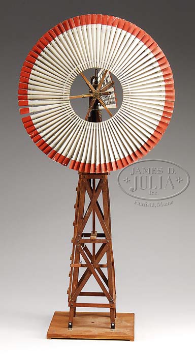 SALESMAN SAMPLE ROCKFORD WINDMILL. Sheet metal windmill on wooden oil derrick-type base. Blades painted white with red tips, tail fin is hand lettered “IXL Rockford, ILL” on both sides. Has hand lever to adjust direction. SIZE: 15-1/2″ w x 32-1/2″ h. PROVENANCE: From the Collection of the late John Woods, St. Louis, MO. CONDITION: Generally good to very good. Wooden shaft connecting tail fin is broken, some blades partially detached, missing some small pieces and some minor repairs. 1-9358 (2,500-3,500) Auction: Advertising, Toy & Doll - Spring 2009 Please Note: All prices include the hammer price plus the buyer’s premium, which is paid by the buyer as part of the purchase price. The prices noted here after the auction are considered unofficial and do not become official until after the 46th day. |