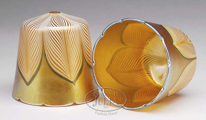 PAIR OF PULLED FEATHER ART GLASS SHADES. White, gold and green iridescent pulled feather decoration on a gold iridescent background with an iridescent gold interior finish and slightly scalloped edges. Unsigned. SIZE: 4″ t with pin hole size fitter. CONDITION: Very good to excellent. 5-66343 5-66378 (150-250)