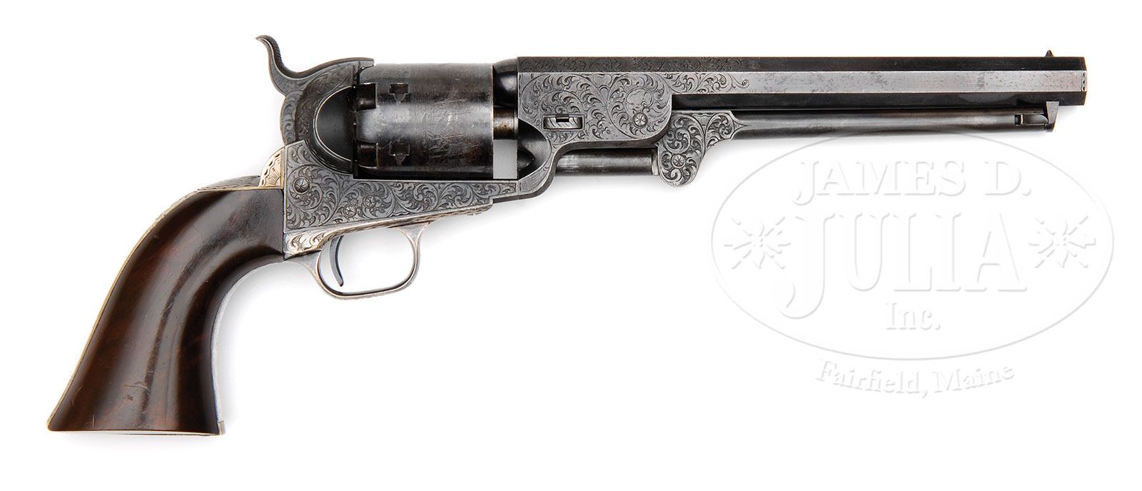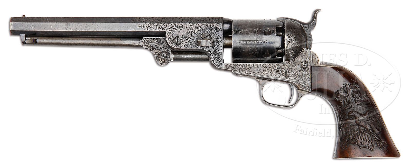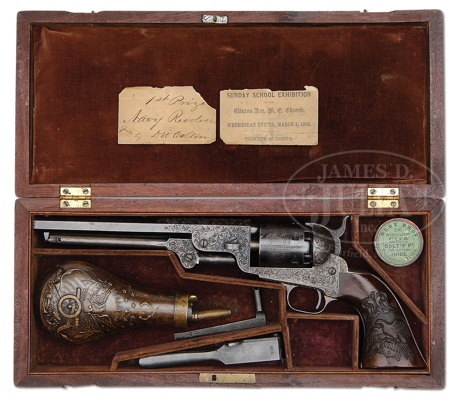 VERY RARE ENGRAVED COLT MODEL 1851 NAVY PERCUSSION REVOLVER. SN 48055. Cal 36. Spectacular Gustave Young engraved Navy with 7-1/2″ oct bbl, brass pin front sight and one line New York City address. Left side of the frame is engraved “COLTS PATENT” in a pillow shape. Revolver has received Mr. Young’s special deluxe engraving consisting of full coverage foliate arabesque patterns on the frame with two scrolls terminating in flower blossoms. Engraving extends over the barrel lug and top side flats with a scroll on the left side terminating in Mr. Young’s distinctive dogs-head pattern and another on the right side terminating in a flower blossom. Barrel address is bordered by a chip & dot pattern. Rammer pivot is engraved to match. The silver plated brass trigger guard & backstrap are engraved to match with Mr. Young’s distinctive sunburst at the top of the backstrap. It is mounted with a wonderful varnished burl walnut 1-piece grip with a spectacular relief carved American eagle on the left side. The eagle is clutching an olive branch & arrows in its talons, over an American shield. The entire vignette is surmounted by relief carved foliate patterns. Backstrap channel of the grip is covered by a very old piece of paper inscribed in India ink “J.Grosch”. There appears to have been possibly a date which has been obliterated. Any number that may have been in the backstrap channel has been covered by the paper. Cylinder is usual six shots with Ormsby naval battle scene roll marking and all six safety pins are crisp and serviceable. All the screw heads & tips are engraved. Accompanied by a scarce, orig, purple velvet lined mahogany casing with shield shaped escutcheon in the front and English style swinging brass latches that were probably added during the period of use. Interior is compartmented in the bottom for the revolver, a scarce dbl sided Eagle and Stars, angle spout, army sized flask, a 2-cavity bullet & ball Colt’s Patten mold with sprue cutter that is marked on the right side “36B”, an L-shaped nipple wrench, a lacquered tin of Eley’s caps and cast lead bullets & balls. Also accompanying in the case is a small card weight ticket stub upon which is printed “SUNDAY SCHOOL EXHIBITION / OF THE / CLINTON AVE. M.E. CHURCH / WEDNESDAY EVE’NG, MARCH 4, 1868 / TICKETS 25 CENTS”. Another small card weight paper is hand written in India ink “1st Prize / Navy Revolver / given by D W Colton”. A quick Internet search disclosed no information D. W. Colton, however the Clinton Ave M.E. Church has been in existence on Long Island, NY since the 1700s. CONDITION: Extremely fine plus, all matching including wedge and cylinder; grip is most certainly original however the number is obscured as noted; bbl retains about 90% glossy orig blue with only faint sharp edge wear and some fine flaking; rammer and handle retain faded case colors; frame retains faded case colors on the right side having turned silver elsewhere; hammer retains smoky case colors; cyl retains about 80% orig blue and shows about 98% Ormsby Naval battle scene roll marking; trigger guard & backstrap retain most of their orig silver plating with some minor thinning & edge wear on the backstrap; grip is sound with only a couple of minor nicks and retains virtually all of its strong original varnish; mechanics are crisp, brilliant shiny bore, appears to be new and unfired. Case has a couple of grain checks in the bottom, otherwise is sound with light handling & storage nicks & scratches and retains virtually all of its orig varnish. Interior is moderately to heavily faded inside the lid with some light staining from contact with the revolver. Bottom is lightly faded with light to moderate soil and has solid partitions. Flask is sound with a few small dents and retains about 75% orig finish; mold is crisp and new, retaining virtually all of its orig blue; nipple wrench & cap tin are fine; flask is probably not orig to this set. Cards are oil stained, yellowed, and brittle with one broken corner and a small tear. 4-48118 JR277 (40,000-60,000)