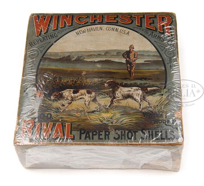 VERY RARE WINCHESTER RIVAL 100-ROUND CHRISTMAS BOX. Wonderful and the most desirable Winchester shot shell box. Box measures 8-1/2″ x 8-3/8″, two pieces with the top & sides are printed in multi-colors with the top having the very large vignette of an early hunter with dbl bbl shotgun approaching his pointer & setter, on point, all in a nicely detailed field scene. Top has red & black Winchester advertising and in the lower right corner is printed “BENTON LITHO. CO. NEW HAVEN. CONN.” The two long sides are printed in multi-color, one with the scene of a live pigeon shoot and the other a pointer and a Llewellan setter with dead birds and a hare in a very detailed scene. Both short edges are printed with a picture of a brown “Rival” No. 10 paper shell in between “RIVAL” and “WINCHESTER” which are in red lettering with other advertising. Both ends show the number “100” and “NO. 10″ along with the cartridge length of 2-7/8”. Bottom of box has the orig Winchester Repeating Arms Co. factory purple stamp “10 9 00” which is the date of manufacture, Oct. 9, 1900. Box contains 78 green paper hull “NEW RIVAL”, new primed empties. CONDITION: Very good to fine. Box top has repaired corners & edges showing tears & wrinkles on two of the sides with some losses; top is mostly intact with a small tear in bottom left corner and a small loss in bottom right corner with edge wear and some light soil and very light fading; colors are mostly vivid & bright; bottom is completely orig with one broken corner, otherwise is completely intact. Cartridges have some minor staining on brass heads, otherwise are fine with crisp cardboard tubes. 4-46819 JR404 (5,500-7,500)