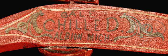 SALESMAN SAMPLE CHILLED PLOW. Massive for a salesman sample, this representation of a Gale Chilled walk behind plow with wood body painted red with black highlights. Hand lettered “Gale Chilled, Albion, Mich.” on both sides. Long wooden handles joined by turned bracket and nickel hardware. SIZE: 27″ l x 11-1/4″ h x 9″ w. PROVENANCE: From the Collection of the late John Woods, St. Louis, MO. CONDITION: Some crazing to paint, structurally very good to near excellent. 1-9350 (3,000-4,000) Auction: Advertising, Toy & Doll - Spring 2009 Please Note: All prices include the hammer price plus the buyer’s premium, which is paid by the buyer as part of the purchase price. The prices noted here after the auction are considered unofficial and do not become official until after the 46th day. |