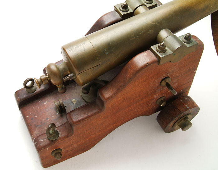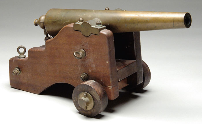 STRONG SALUTE CANNON. 8 bore. 17-1/2″ brass bbl, including cascable. Marked “MANF’D BY / THE STRONG FIRE ARMS / –CO– / eagle / NEW HAVEN. CONN. / U.S.A.” on top of the breechblock. On a 13-1/2″ long x 8″3/8″ high mahogany naval carriage with wooden wheels, all brass mountings. The knob for the breech lock is missing. One of the carriage bolts is missing. The sear loop is missing and a wood knob has been substituted. The elevation wheel is in place. CONDITION: Dark to mellow patina overall. Mechanically functional. 4-60350 (4,000-6,000)