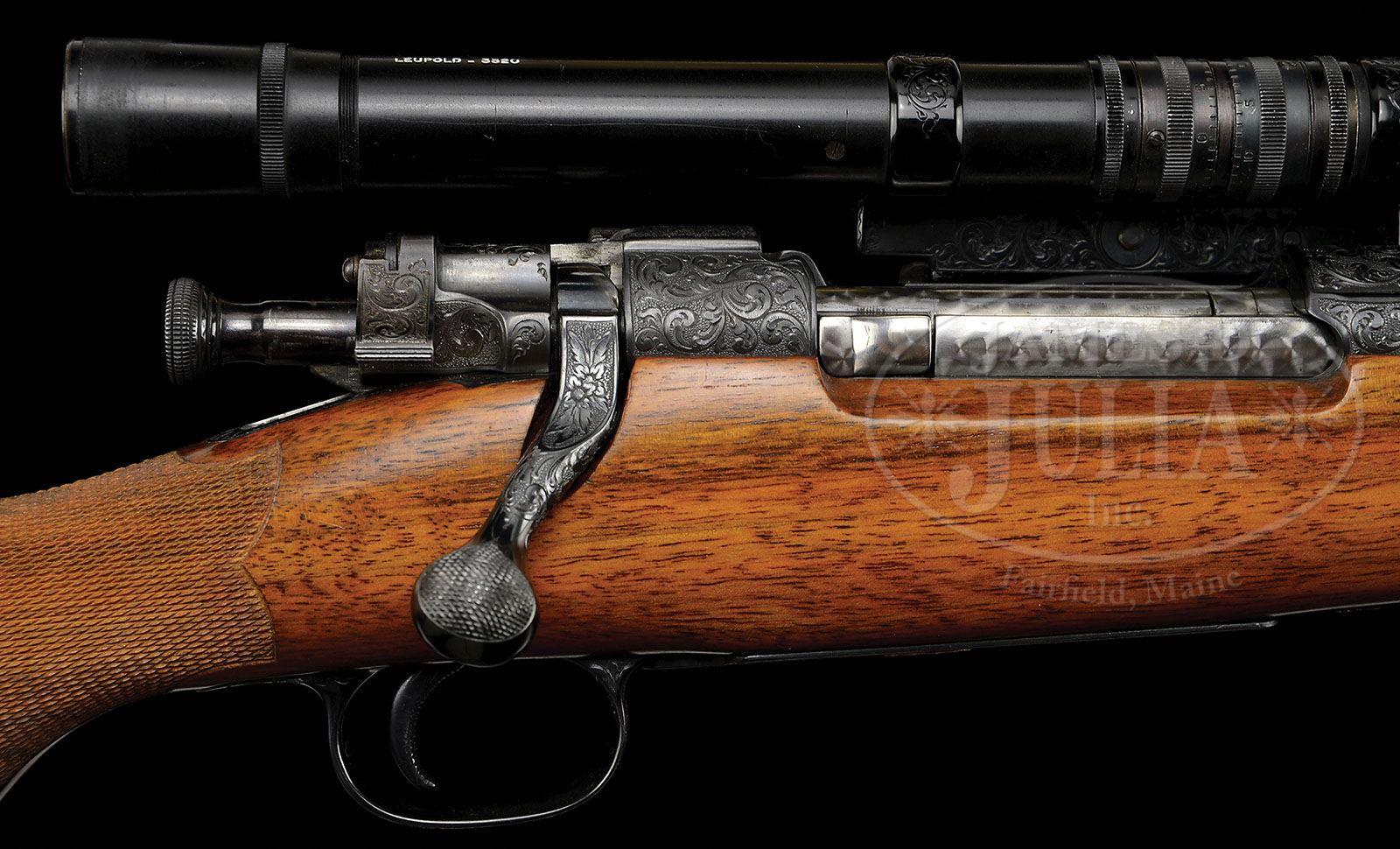 Additional Information: Consignor has informed us that the gold inlays on this rifle were executed by noted engraver Alvin White, who did most of the work on Owen’s later guns. *ENGRAVED AND GOLD INLAID 1903 SPRINGFIELD, MARKED R. G. OWEN, WITH SCOPE. SN NSN. Cal. 256 Newton. 22″ Medium weight sporter bbl is engraved “R. G. Owen – Newton 256, # 1″ on top, which is engraved with large, open, shaded scroll for 6″ down the bbl at rear, and with matching scroll around ramp front sight base holding gold bead sight. 1903 Springfield action is fitted with Jaeger side mount, and has had tang altered to give more pleasing line. Bolt body has been engine turned and a Model 70 style checkered bolt knob installed, and has been fitted with Buehler safety. Bottom metal has had trigger guard bow nicely re-shaped to a slim line. Action, rear portions of bolt, and bottom metal are engraved with large, open, shaded scroll matching bbl. This scroll on bottom metal surrounds well detailed relief gold inlaid game animals with a moose head on front portion, a pronghorn antelope in oval vignette on floorplate, and a face-on coyote on trigger guard bow. Lightly marbled and figured European walnut stock measures 13-3/8” over Neidner steel buttplate, and features right hand shadow line cheekpiece, engraved steel grip cap, horn forend tip, sling swivel eyes, curved pattern borderless wraparound checkering, and a silver oval on toe line engraved “J. H. N.” Rifle is fitted with an early Leupold 2-1/4 X scope with 8 X extension and aluminum Jaeger single lever side mount engraved to match rifle. Weight with scope: 8 lbs.4 oz. LOP: 13-3/8″. CONDITION: Excellent, retaining nearly all of its custom finishes on wood and metal, with a few light handling marks. Bore is excellent. Action is smooth. Scope optics are clear. 4-49240 MGM288 (6,000-9,000)