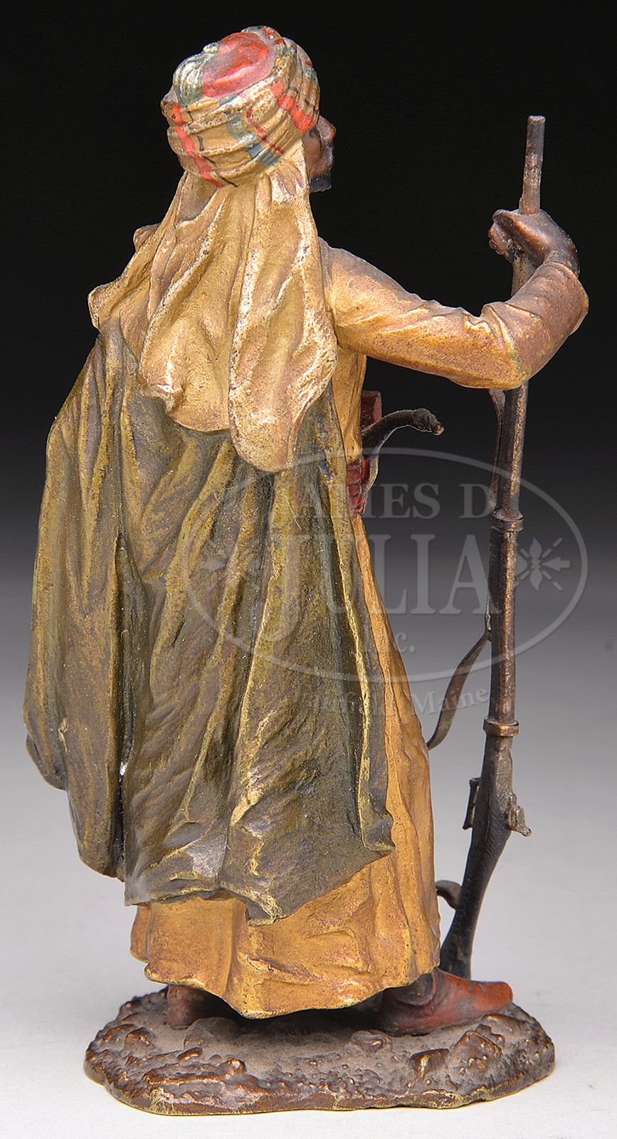 FRANZ BERGMAN FOUNDRY (Austrian, 1838-1894) STANDING ARAB MAN WITH RIFLE. Cold-painted polychromed bronze Foundry impressed mark to base SIZE: 5-3/4″ h. CONDITION: Very good. 9-29717 (500-800)