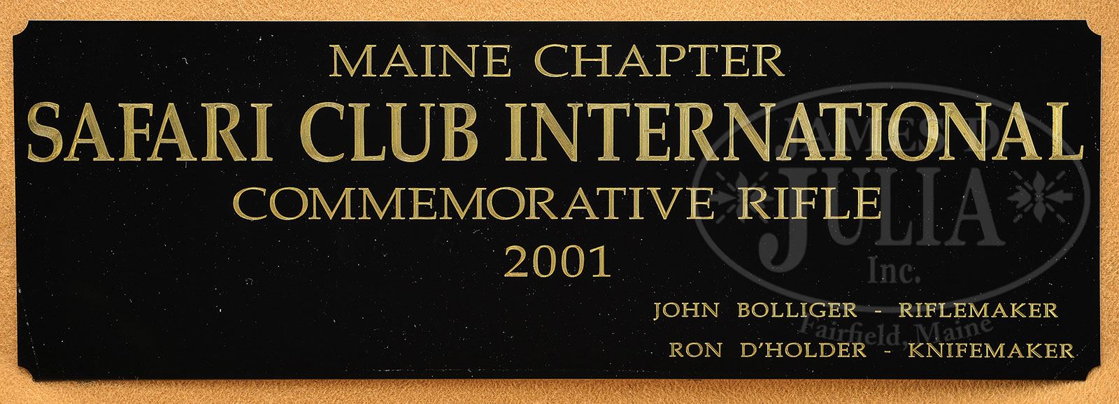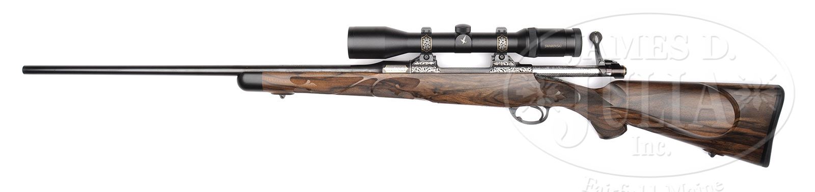 Our description states Ron D’holder was the knife maker and that the knife is signed “D’holder Phoenix, AZ”. The maker is D’Alton Holder not Ron D’holder. *JOHN BOLLIGER 2001 SCI STATE OF MAINE CUSTOM MODEL 70 WITH SCOPE, KNIFE, AND CASE. SN 6305497. Cal. .300 Win mag. 24″ Light sporter round bbl is engraved “Maine Chapter Safari Club International 2001” on top. Rear boss has rectangular bright areas with gold borders; silver field on right side engraved with John Bolliger’s signature and “Riflemaker”, left field engraved with caliber. Model 70 action, with controlled feed, has been fitted with custom scope bases forming raised square bridge and receiver ring cut to accept Talley type rings. Bolt body has been engine turned and handle straightened, with pear shaped knob added, which is checkered with four teardrop panels and square base panel. Bottom metal is Blackburn type, with hinged floorplate, secured by button release in trigger guard bow. Action, floorplate, trigger guard bow, and sides of scope rings are semi-relief engraved with open flowing acanthus scroll, highlights of which have been polished. Gold wire borders are on floorplate, trigger guard, action tang, and scope rings. A moose head with large rack is relief gold inlaid on center of floorplate. Engravers initials “JD” are at rear of floorplate. Intricately streaked European walnut Signature Series” style stock features swept shadow line right hand cheekpiece, ebony forend tip, black “Old English” rifle pad, and raised oval islands mounting sling eyes. Steel grip cap is engraved to match action. Well cut fleur-di-lis checkering has ribbons through pattern. Swarovski 2.5 – 10 X 42 Habicht scope with duplex reticle is in Talley rings. This fine rifle is accompanied by its custom made fancy walnut presentation case having molded top and tall pedestal feet. Heavy lid is secured by brass piano hinge and retainers at each side. Case is lined in fawn cloth with black laminate label on lid with gold engraving “MAINE CHAPTER” “SAFARI CLUB INTERNATIONAL” “COMMEMORATIVE RIFLE” “2001”. John Bollinger is listed as rifle maker and Ron D’holder as knife maker. A custom knife by him is included in the case. Knife has 4-1/2″ slightly dropped point skinning blade marked “D’holder Phoenix, AZ”. Bolster is of German silver with band of engraving to match rifle. Handle is of birds-eye maple with agate, brass, and antler bands. Case is French fitted for knife, rifle, bolt, square oil bottle, and brass cleaning rod with ebony handle. Weight with scope: 8 lbs 13 oz. CONDITION: Excellent, possibly unfired since making, retaining essentially all of its metal finish, polished areas toning, with some areas of darkening. Wood is excellent with only one or two almost unnoticeable marks. Checkering is clean and bright. Scope is excellent with bright, clear optics. Exterior finish of case has lightened, and slightly lifted. Mitered corners of top are coming apart. Interior cloth is excellent, as are oil bottle and cleaning rod. Knife blade has some areas of light pitting and discoloration (should clean). 4-48689 MGM7 (10,000-15,000)