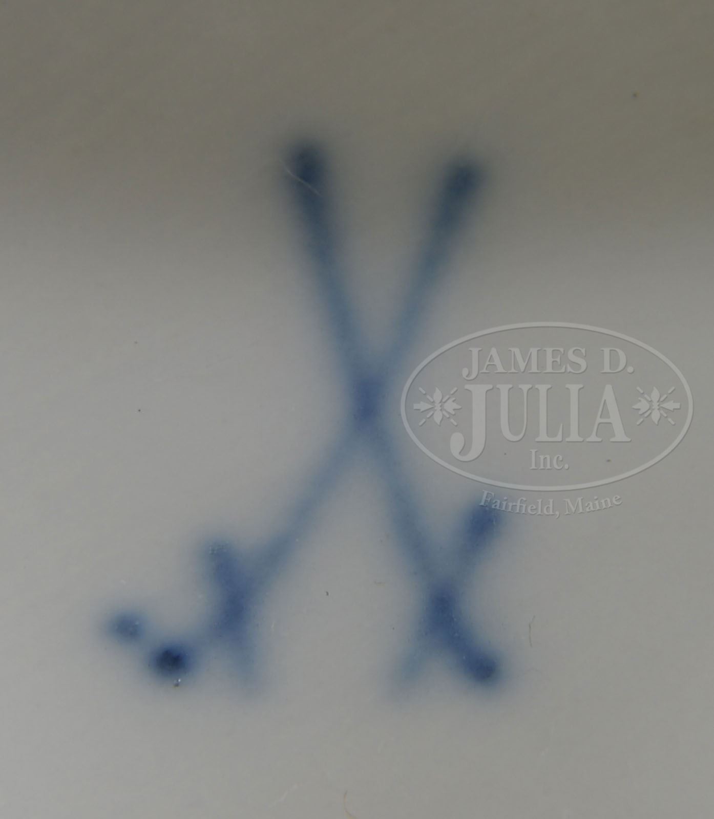 MEISSEN PORCELAIN MAGPIE. Large Meissen porcelain bird in the form of a magpie rests atop a white porcelain stump with green leaves at the bottom. The magpie is done in black and white with blue on its wings and green tail. Figure is marked on the underside with blue crossed swords mark. SIZE: 20-7/8″ t. CONDITION: Very good to excellent. 5-67693 (1,000-1,500)