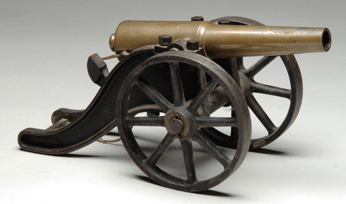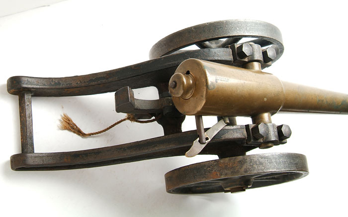 STRONG SALUTE CANNON. 10 ga. 10-1/4″ brass bbl, including cascable. Marked “STRONG F. A. CO. / NEW HAVEN. CT.” on top of the bbl. The plug breechblock is locked by a pin operated by a lever on the right side. The extractor is fastened to the pin. The firing pin is in the breechblock and is fired by a hammer, pivoted on the elevation post. Cast iron carriage, 9-3/4″ long x 5-5/8″ high. The iron wheels are 6″ in diameter. CONDITION: Dark patina on the bbl with some corrosion at the muzzle. Carriage has about half the orig black paint finish remaining. Mechanically fine. 4-60351 FS818 (2,500-3,000)
