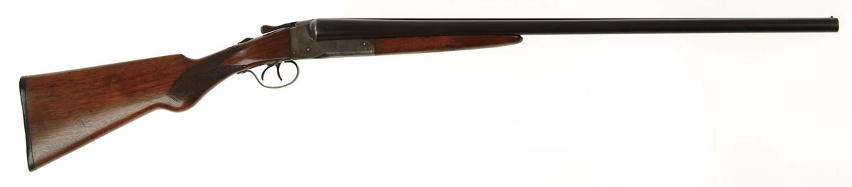 *LEFEVER NITRO SPECIAL DBL BBL SHOTGUN. Cal. 12 ga. SN 117753. Usual configuration with 28″ bbls choked FULL/MOD with tapered serrated flat rib with single bead and rib extension with extractors & dbl triggers. It has boxlock receiver with a flying duck on each side. The bbls on each side and on both sides of the receiver are stamped “TC” and a “K”. It has straight grain American walnut wood with flat-checkered splinter forearm and semi-pistol grip stock, 13-7/8″ over a serrated hard rubber buttplate. CONDITION: Good to very good. Bbls retain 85-90% dull blue turning plum in areas. Receiver retains case colors in sheltered areas being mostly a silver patina. Stock has a hairline back of the top tang, otherwise the wood is sound and retains most of an old refinish. Good mechanics, bright bores with scattered light pitting. 4-54400 JR138 (300-500)