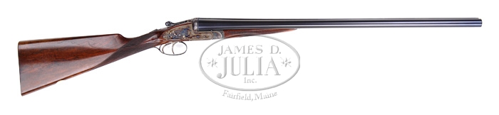 Lot Added. *SUPERB HOLLAND & HOLLAND (A&F) MODEL SIDELOCK SIDE BY SIDE SHOTGUN. SN 34709. Cal 12 GA. This superb shotgun was made by Holland & Holland for Abercrombie and Fitch in the 1960’s, and entered as a special model in the A & F records. It’s interesting to note that this model sold at a price equal to or above an H & H Royal model even though it did not have the self opening feature. 2-3/4″ Chamber. 26-1/2″ dove-tailed lump bbls. Marked on concave top rib “Abercrombie & Fitch”. Bbls show Birmingham nitro proofs at .729, 2-3/4″ chambers, and 3-1/4 tons PSI. Also marked w/ SN “34709”. The dbl trigger rose and scroll engraved action is inlaid with the A&F Company logo in gold on the bottom, and has “Holland & Holland” on the lock plates. “Safe” is inlaid in gold on the top tang. The tumbler ends have gold inlaid cocking indicators. Rose and scroll engraved trigger guard has SN “34709” on the grip. The finely figured straight grip buttstock measures 14 1/2″ to a checkered butt, and features a gold oval engraved with “PLJ,” drop points and 22 LPI checkering w/ mullered borders.The Anson splinter forend has SN inside w/ matching wood and checkering. The leather case is “EB” embossed on the outside of the lid and has maroon baize lining with leather Maker’s label, containing Holland and Holland marked oil bottle, snap caps, and cleaning implements. Bore diameter: left -.728, right -.728. Bore restrictions: left -.020, right -.010. Wall thickness: left -.033, right -.033. Drop at heel:2-1/8″ , drop at comb:1-3/8″ . Weight:6lbs 8oz. Included with this lot is an archive letter from Griffin and Howe, describing the gun and its price, as well as a copy of a page from the original A & F inventory records showing it as an A & F model. Hard to improve upon this English classic! CONDITION: Extremely Fine. Bbls retain virtually all of their original English black finish . Bores are bright, shiny. Action is tight and on face, ejectors are in time. Action retains most of its beautiful and vibrant original hardening colors with only a hint of wear at the sharp edges of the action body. Trigger guard retains 85% blue with some thinning at the grip. Screw slots nicely indexed and appear untouched. Buttstock appears as new retaining virtually all of its finish with a few very light handling marks. Case shows some light scuffs on exterior, interior is clean and sound. 4-37283 BDT302 (20,000-30,000)