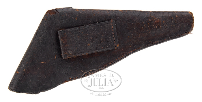 EXTREMELY RARE ATLANTA ARSENAL MADE HOLSTER. There are no more than 10 maker marked Confederate holsters known to us and this is only the 2nd from the Atlanta Arsenal we know of. This flap holster was made for a Colt Pocket pistol or similar sized gun. This holster is complete with belt loop and closure strap. The markings: ATLANTA ARSENAL/GA/1862” are excellent and easily read. This holster was for many years loaned and on display in The Atlanta Historical Society now the Atlanta History Center. A very rare Confederate marked accoutrement and probably the only marked Confederate holster for a pocket sized pistol known. CONDITION: Good overall with crazing, flaking and cracking and chipping. Holster is dry and flat from display. 4-32834 JS15 (5,000-7,000)