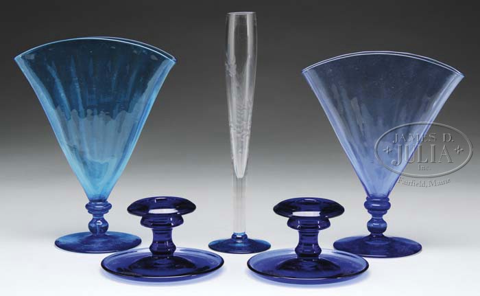 FIVE PIECES OF BLUE STEUBEN GLASS. 1) Celeste blue fan vase with slight vertical ribbing and applied pedestal foot. Signed on the underside with Steuben fleur de lis mark. 2) French blue fan vase with slight vertical ribbing and applied pedestal foot. Signed on underside with Steuben fleur de lis mark. 3) Clear crystal bud vase with applied Celeste blue saucer foot and carved with floral decoration. Unsigned. 4-5) Pair of Flemish blue candlestick holders. Unsigned. SIZE: Ranges from 3″ to 10″ t. CONDITION: Very good to excellent. 5-61690 (200-300)