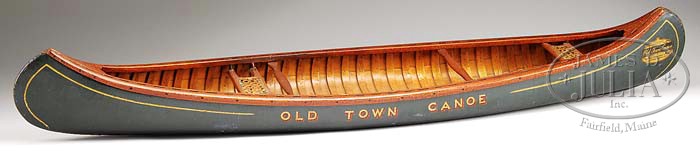 Additional Information: One cross piece may have been replaced. SALESMAN SAMPLE OLD TOWN CANOE. Circa Late 19th/Early 20th Century. Outstanding wooden construction with ribbed interior framework and attached seats. Exterior is deep forest green with yellow pinstripes stenciled “Old Town Canoe”. Retains original decals on both sides from this Old Town, ME manufacturer. SIZE: 48″ l x 9″ w. PROVENANCE: From the Collection of the late John Woods, St. Louis, MO. CONDITION: Very good to excellent. Overall crazing to original painted surface with various chips to paint and alligatoring to wood. 1-9362 (5,000-10,000) Auction: Advertising, Toy & Doll - Spring 2009 Please Note: All prices include the hammer price plus the buyer’s premium, which is paid by the buyer as part of the purchase price. The prices noted here after the auction are considered unofficial and do not become official until after the 46th day. |