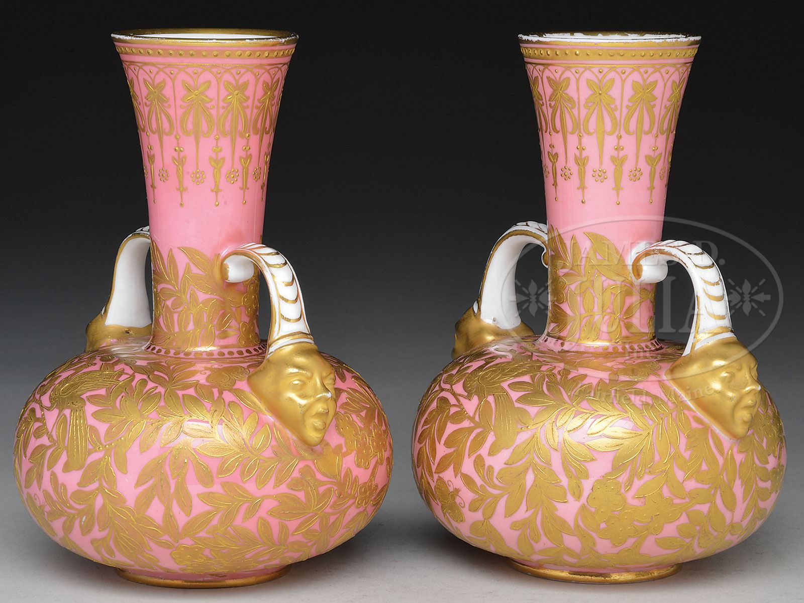 PAIR OF DARBY PORCELAIN VASES. Darby vases are decorated with allover gilded vegetation with birds and butterflies amongst the leaves. The decoration is all done against a lovely pink background and is finished with two applied white handles trimmed in gold and terminating in gilded faces. Each vase is signed on the underside with Darby mark; one in blue and one in pink. SIZE: 6-1/8″ t. CONDITION: Very good to excellent with minor wear to gilding on lip of each vase. 5-67690 (200-400)