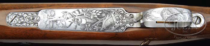 Additional Information: Stock is a replacement Safari-grade stock. The stock has tested positive for traces of salt as normally found on Brownings of this time period. Small spot of rust on inside of tang hole under the stock (typical of salt finish stock). *OUTSTANDING BROWNING OLYMPIAN BOLT ACTION RIFLE. SN 7P41906. Cal. 30/06. 24″ rnd bbl with no provision for sights. Bbl is marked on left side “BROWNING ARMS CO” and right side “CALIBER “.30-06″ ONLY 7P41906/MADE IN BELGIUM”. There is a 2″ wedge of scroll engraving down each side of bbl. The Olympic grade receiver is engraved on left side of front ring with a bull elk and signed “A MARECHAL”. Right side is engraved with a buck antelope and marked “AM”. The remainder of upper receiver is a foliate scroll with a shaded background. The floor plate is engraved with a buck whitetail deer, with trees in the background and fern leaves in the foreground, and signed “L LAMBERT”. Trigger bow is engraved with a stalking bear and marked “JL”. Mounted with nicely figured walnut, wrap around checkered forend, checkered pistol grip, left side cheek piece, Browning marked hard rubber butt plate, and sling swivel studs. PROVENANCE: Tom Clinton Collection. CONDITION: Extremely fine. Gun appears near new and test fired only. There are a couple of minor faint scratched on bbl. The receiver is bright and crisp. Stock is sound with just a very few light handling marks, and a minor flake of finish on sharp edge of cheek piece. Even though this is a salt era gun, pulling the metal from the wood reveals no signs whatsoever of it being a salt cured stock. Mechanics are crisp with a nice shiny bore. 4-37372 BDT15 (4,000-7,000)
