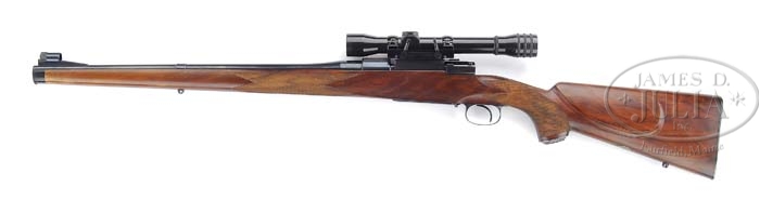*GRIFFIN AND HOWE MAUSER MANNLICHER CARBINE WITH SCOPE AND CASE. SN 2183. Cal. 30-06. 20″ Round barrel is engraved “No. 2183 Griffin & Howe Inc. New York” on top and “30/06 – Gov.” at rear, and features stippled ramp front base w/ longitudinally dovetailed brass bead front w/ hood. FN type model 98 action has checkered bolt knob, stippled top receiver, button detachable floor plate, wing safety, Lyman 48 receiver sight base w/ blank slide (Aperture slide is in case), and Griffin and Howe scope mount. Single stage trigger is checkered. Full pistol grip lightly streaked European walnut full length stock measures 13-3/4″ over checkered steel M 70 type butt plate, and features classic G & H shadow line cheek piece, steel grip cap, ebonite forend tip, barrel band sling swivel base, vacant silver oval, and very nicely executed 20 LPI checkering w/ double line and mullered borders. Weight: 7 lbs 8 oz. Weight w/ scope: 8 lbs. 5oz. Scope is a 4X Kollmorgen in Griffin and Howe rings. Green canvas full length case w/ leather corners has green baize interior w/ Griffin and Howe paper label. Accessories include early crystal glass cork stoppered oil bottle, Boyt leather sling w/ QD swivels, aperture slide for rear sight, case straps, and key. CONDITION: Very Good to Excellent, with only a very few minor marks on metal. Stock has a professional repair at the wrist and is sound. Bore is excellent. Scope is excellent, optics somewhat cloudy. Case is as new. 4-87608 (4,000-6,000)