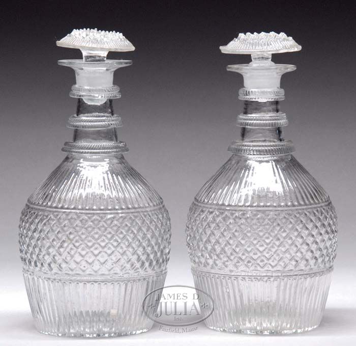 PAIR OF EARLY BLOWN MOLDED GLASS DECANTERS. Each having matching period stoppers. The identical pair having three-ring neck, diamond band with lower and upper ribbing. Open pontil base. Early 19th Century. SIZE: 9-1/4” total height. CONDITION: Very good. 9-74239 SM (400-600)