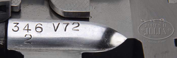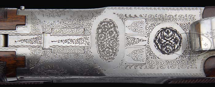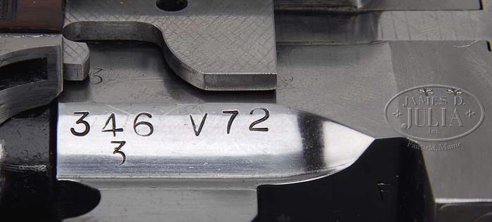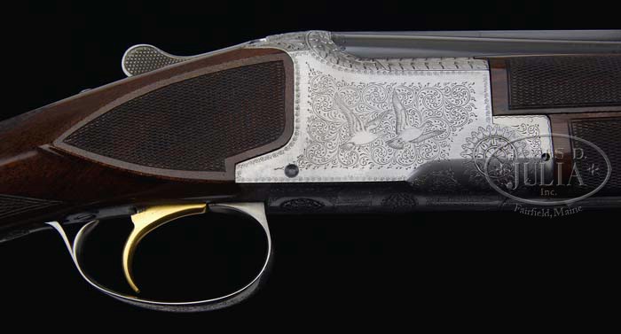 *SPECIAL ORDER BROWNING PIGEON GRADE SUPERPOSED SHOTGUN 3-BBL SET. SN 346V72. Cal. 20, 28 and 410. 20ga bbls, 28″ matted vented rib with single silver sighting bead, 3″ chambers, MOD/FULL choke, ejectors and single select trigger. Bbl set two; 28ga, 28″ with matted vent rib and single silver sighting bead, SKEET/SKEET choke and ejectors. Bbl set three; 410ga, 28″ matted vent rib with single silver sighting bead, MOD/MOD choke and ejectors. Usual Browning receiver with typical Pigeon Grade engraving with fine foliate arabesque scroll with pigeons in flight over the top on each side, two bouquet of flowers on bottom and carved oak leaves across the top. Balance of receiver is fine foliate scroll mounted with highly figured walnut. All bbls with three-piece fully checkered schnable forends. Checkered straight grip stock with checkered side panels with Browning marked vented skeet recoil pad. Gun is accompanied by a letter from Browning historian Glen Jensen identifying gun as a Browning B-25 Superposed Pigeon Grade 20ga, Lighting Over/Under with 28″ bbls, choked MOD/FULL, vent rib and special FN-style schnable forends, English style straight grip stock, long trigger guard, 1-1/2 x 2 x 14-3/8 with skeet recoil pad and 1 degree cast for left hand shooter, use extra, extra fancy American walnut on stock and forearm and supplied with checkered side panels. This gun was manufactured in Belgium. The shotgun sold at retail for $2,600 Feb. 28, 1974 on invoice #14156 to Bill’s Trap & Skeet Supply, Glenwood, IL. Set 1: Bore diameter: top .620, bottom .620. Bore restrictions: top .025, bottom .010. Wall thickness: top .036, bottom .036. Drop at heel: 1-7/8″, drop at comb: 1/1/2″. Weight: 6lbs. 5oz. LOP 14-5/16″. Set 2: Bore diameter: top .550, bottom .549. Bore restrictions: top .010, bottom .010. Wall thickness: top N/A, bottom N/A. Drop at heel: 1-7/8″, drop at comb: 1-1/2″. Weight: 6lbs. 8oz. LOP 14-5/16″. Set 3: Bore diameter: top N/A, bottom N/A. Bore restrictions: top N/A, bottom N/A. Wall thickness: top N/A, bottom N/A. Drop at heel: 1-15/16″, drop at comb: 1-1/2″. Weight: 6lbs. 11oz. LOP 14-5/16″. Accompanied with Browning tan luggage case with fuzzy white interior. CONDITION: Extremely fine. All bbls retain 98-99% orig blue with some minor handling marks and faint rub mark on bottom bbl from forend. Receiver retains virtually all of its fine French gray finish. Stock is sound with good checkering, a few minor nicks and retains nearly all of its fine Browning factory finish. All forends are sound with only a few minor handling marks, sharp checkering and retain nearly all of their orig Browning finish. Mechanics are crisp with strong ejectors and nice shiny bores in all bbls. Case is excellent with a few minor scuffs. 4-37286 BDT197 (12,500-17,500)