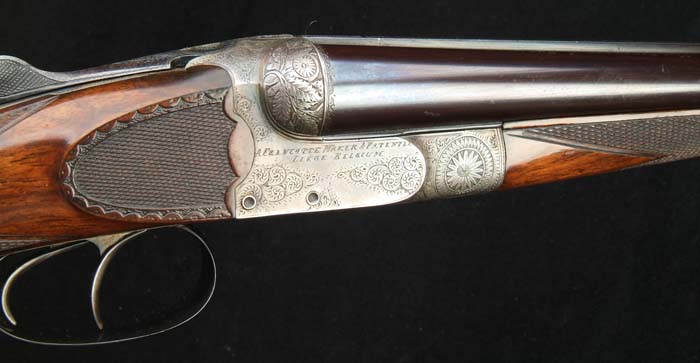 *SCARCE LIGHTWEIGHT FRANCOTTE DOUBLE BARREL SHOTGUN. Cal. 28 ga. SN 63103. Wonderful little bird gun with 26-1/8” steel bbls choked FULL/MOD with tapered, concave, matted rib, dbl ivory beads, Greener crossbolt rib extension, dbl underbites with extractor & dbl triggers. Mounted with nicely figured, slab sawed, checkered walnut with splinter forearm & Prince of Wales rnd knob stock with carved & checkered side panels, 13-3/4” over a serrated horn buttplate. There is a blank gold oval in left side of buttstock. Receiver is very nicely engraved with about 70% coverage, fine foliate arabesque patterns with leaves & vines on the fences with both sides of the receiver having maker’s name. Unable to gauge bore diameter, bore restrictions or wall thickness. Drop at heel: 2-7/8”, drop at comb: 1-3/8”. Weight: 4 lbs. 15.68 oz. CONDITION: Fine. Bbls & triggerguard retain 97-98% of a restored finish turned plum. Receiver retains 50-60% orig case colors, strong & bright in the most sheltered areas, thinning on sides and turned silver on bottom. Wood is sound and retains about all of a fine, professionally restored finish with freshened checkering. Mechanics are fine, bright shiny bores. 4-30720 JR429 (3,000-5,000)