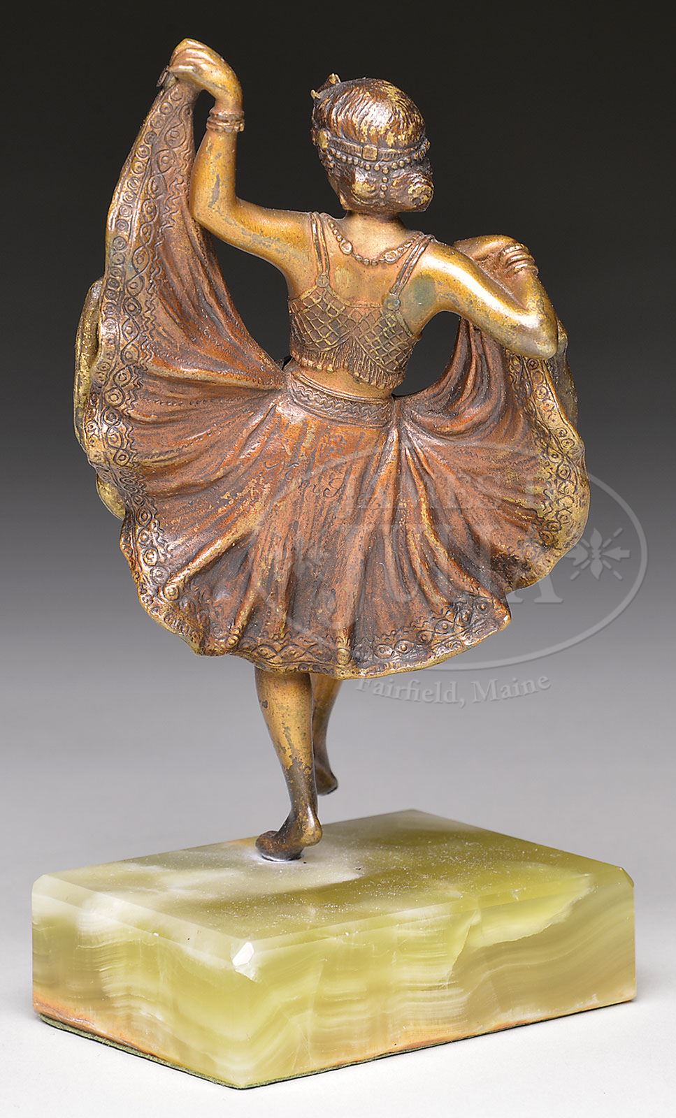 NAM GREB (Austrian, First Quarter 20th Century) EROTIC DANCER. Articulated bronze on onyx base Signed “Nam Greb” SIZE: Total: 6-3/4″ h x “. Bronze alone: 5-3/4” h. CONDITION: Some rubs to patina. Otherwise very good. 9-29850 (500-800)