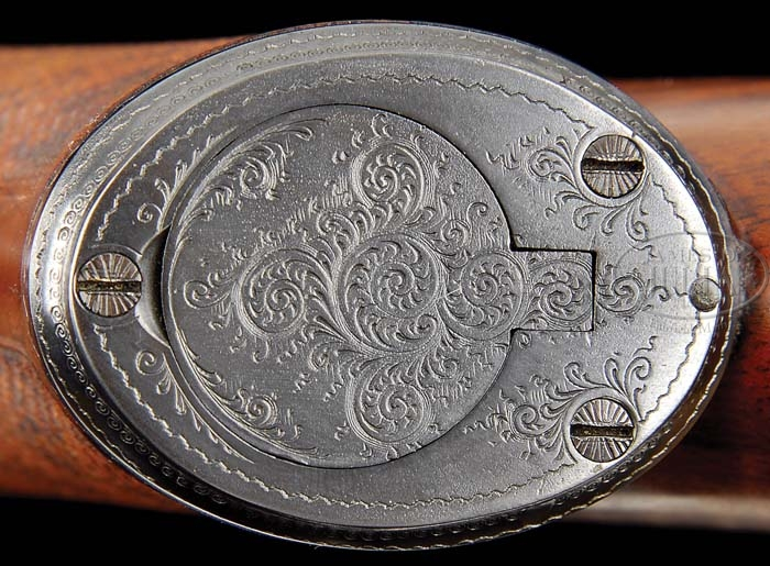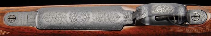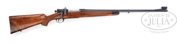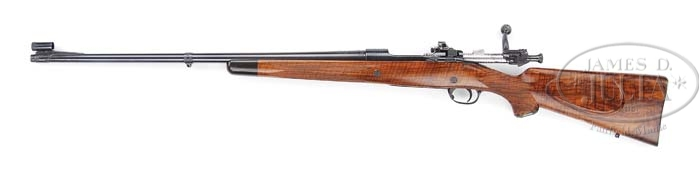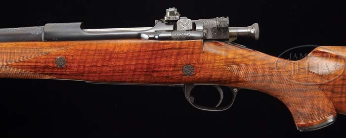 *VERY RARE R.G. OWEN KORNBRATH ENGRAVED CUSTOM SPRINGFIELD SPORTING RIFLE. SN 511. Cal. 30-06. Spectacular Owen rifle with 24″ tapered rnd bbl, custom sleeve front sight with hand matted ramp and locking hood. There is no provision for a rear bbl sight and the receiver is mounted with a Lyman 48S peep sight. Mounted in spectacular center crotch cut, fiddleback, Claro walnut with horn forend tip and Mr. Owen’s custom steel grip cap with trap and checkered Niedner steel buttplate with trap. The bbl has a stalking sling mount with a corresponding stud in the stock. Bottom of stock has an initial plate engraved “R.V.P.”. The custom trigger guard & floor plate also has a custom cross bolt safety which locks the trigger. Trigger is full checkered. Top of receiver, top of bbl, cut-off, receiver sight, bolt handle, shroud & safety are wonderfully engraved with Rudolph Kornbrath’s spectacular, delicate foliate arabesque patterns with a floral bouquet over the chamber area. Floor plate & trigger guard, along with the grip cap are also engraved by Mr. Kornbrath with spectacular intertwined foliate arabesque patterns & floral bouquets in the center of the floor plate & trigger bow. Screws are also engraved. This spectacular rifle is, most unusually, signed by Mr. Owen in three places. The top of the barrel has his name & address along with the serial number. The front receiver ring has Mr. Owen’s name on the left top side and address on the right top side. The front trigger guard extension is also engraved with Mr. Owen’s name & address. Bolt body, extractor, follower & outside rail are very finely jeweled. Bolt knob is fully checkered and separated into panels. Stock has two reinforcing bolts that are Kornbrath engraved with his typical rosette patterns. This is truly a spectacular piece of work and some of Kornbrath’s finest engraving. CONDITION: Extremely fine plus. Overall retains virtually all of its custom finish to both metal & wood. It appears to be unfired since completion. Wood has one or two very minor, tiny mars in surface finish. Mechanics are crisp, brilliant shiny bore. 4-38785 JR78 (10,000-15,000)