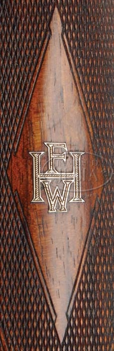 *VERY FINE R. G. OWEN BOX LOCK GAME GUN ENGRAVED BY RUDOLPH KORNBRATH. SN 5329. Cal. 12 Ga. 2-1/2″ Chambers. 28-1/2″ Dovetailed bbls are inlaid in gold “R. G. Owen, Sauquoit, NY” on raised matted concave game rib with cross bolt extension. Bbl flats have German nitro proofs for 12 Ga. with proof date of 8/27. Bottoms of bbls have other proofs and are marked “Roechlings (logo) Spezial”. SN is on bottom of right bbl. Also there’s a monogram “MH”, probably actual gun makers mark, as this also appears on water table. Round bodied box lock double ogee back action features automatic safety, double trigger (front articulated), and Greener cross bolt third fastener. Action is finely engraved with open scroll and rose bouquet motifs. Bouquets on floor plate and trigger guard are in relief, and inlaid in 2 colors of gold. Fences are meticulously fully relief engraved in oak leaf and acorn motif with fine matted background. Top lever also has small 2-color gold inlay of two roses and leaves. All engraving is most likely the work of Rudolph Kornbrath as virtually all of Owen’s work was done by him. Honey colored well figured and mottled Circassian walnut straight grip buttstock measures 13-7/8″ over ribbed wood butt, and features small vacant gold oval, and 24 LPI checkering with line border. Matching splinter forend has Anson release, and monogram “WFH” inlaid in silver in central open diamond. Forend iron also has one small inlaid gold flower on bottom edge. This is one of many well thought out appointments on this gun, another is that the line borders of the checkering stop three diamonds short of the internal points thereby forming small arrowheads (Owen’s signature)in the checkering pattern. Bore diameter: left -.724, right -.724. Bore restrictions: left -.047, right -.045. Wall thickness: left -.032, right -.035. Drop at heel: 2-5/16″, drop at comb: 1-9/16″. Weight: 6 lbs. 11 oz. CONDITION: Very fine. Bbls retain virtually all of a high quality re-black. Action retains 40-60% of original case color, turning a pleasing gray brown on bottom, and on fences. Stocks retain most of what appears to be their original finish, maintained over the years with a little extra oil rubbed on. Checkering is slightly worn. Action is tight. Bbls are on face. Ejectors are in time. Bores are excellent. 4-38477 MGM56 (20,000-30,000)