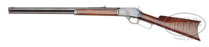 MARLIN 1888 LEVER ACTION REPEATING RIFLE. SN 20677. Cal .38-40. 24″ oct bbl with full magazine. Rocky Mountain front sight with nickel silver blade and Rocky Mountain rear sight. Bbl is marked “MARLIN FIRE-ARMS CO, NEW-HAVEN, CT. U.S.A./PATENTED OCTOBER 11.1887.” Stocked with slab-sawed American walnut with crescent steel buttplate. PROVENANCE: George F Peters Collection. CONDITION: Bbl and magazine tube retain 40% blue blending with patina and areas of very light spotting. Action has 30% blue blending with patina and light corrosion. Hammer and lever retain traces of case colors fading to silver or patina with spots of light corrosion. Buttstock has fine cracks on the left side of the top and lower tangs. Wood is un-sanded with finish added showing moderate to heavy handling marks. Sound mechanics. Bore has good rifling with light developing pitting. 4-41748 DS21 (2,000-3,000)