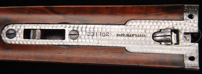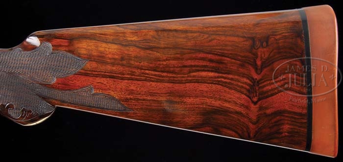 Additional Information: Gun is accompanied by a Griffin & Howe research letter confirming it’s grade and configuration as received into the Consigned Gun Inventory of Abercrombie & Fitch on 10/9/1930 from Harry L. Spicer. A copy of this letter and the A & F Ledger page are included with this lot. *VERY RARE IDENTIFIED PARKER A-1 SPECIAL SIDE BY SIDE SHOTGUN. SN 231102. Cal. 16 ga. 30″ Peerless steel bbls, with matted tapered concave rib, dual ivory sighting beads, 2-3/4″ chambers, MOD/FULL chokes, ejectors, and single selective trigger. Top rib of bbls marked “PARKER BROS. MAKERS. MERIDEN. CT. U.S.A. PEERLESS STEEL”. Muzzles have narrow engraved band, chamber areas have 2-1/2″ wedge of fine scroll engraving. Bbl flats have Remington date code “EL3”. The “1” size frame is fully engraved with tight foliate arabesque scroll, vignette of flowers on each side, two vignettes on flowers on trigger plate, “Parker Bros.” on each side, scroll engraved fences with 3 ribs, and a raised rib outlining the raised portion of receiver. Top lever and tang are fully foliate scroll engraved with gold “S” at safety. Trigger guard is engraved with tight foliate arabesque scroll, raised gold SN. Trigger plate has gold “L&R”, gold trigger and selector. Mounted with streaky and burl wood walnut, checkered side panels with ribbons, fleur-de-lis drop points, carved and checkered semi-pistol grip with gold oval engraved “JACK TURNER”. 1″ Silvers type recoil pad, checkered and carved splinter forend. Inside forend iron, bbl flats, bottom of lugs, water table and standing breech are all finely engine turned. Bore diameter: left -.667, right -.670. Bore restrictions: left -.022, right -.018. Wall thickness: left -.027, right -.037. Drop at heel: 2-1/2″, drop at comb: 1-5/8″. Weight: 6lbs. 12oz. LOP 13-7/8″. PROVENANCE: Dr. David Rozier Collection. CONDITION: Very fine. Bbls retain 98-99% of a fine factory quality restored rust blue, a few minor nicks & scratches & faint rub mark from forend. Receiver retains 30-35% thinning orig case colors, mostly in protected areas, blending with a fine silver patina. Trigger guard retains most of a fine professional quality restored finish with slight thinning at sharp edges. Stock is sound with small nick in pistol grip, some minor nicks & scratches and retains most of a factory quality restored finish. Forend is sound with a few minor handling marks and retains virtually all of its fine professional factory quality restored finish. Mechanics are crisp with auto-safety, strong ejectors, and bright shiny bores. 4-38339 BDT143 (80,000-120,000)