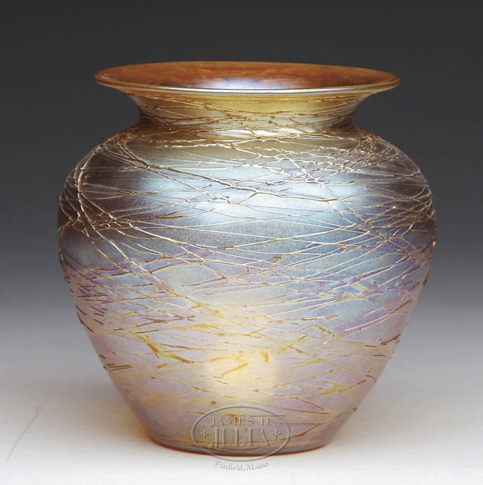 DURAND THREADED VASE. Lovely Durand vase has gold iridescent body with flashes of blue and purple. Vase is covered with random threading. Signed on the underside “Durand 1710-6″ in a V. SIZE: 6” t. CONDITION: Thread loss primarily to lower half of vase, otherwise very good. 9-28538 (300-400)