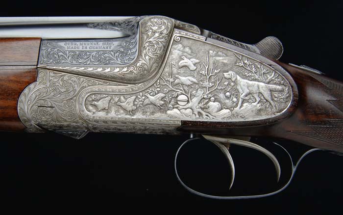 *FABULOUS MERKEL MODEL 303EJ OVER/UNDER SHOTGUN. Cal. 12 ga. SN 96739. Spectacular Merkel with 28” superposed bbls choked FULL/MOD with flat, tapered, matted, solid rib, sgl bead, dbl crossbolt extensions, dbl underbites, ejectors & dbl triggers, the front articulated. Mounted with extremely beautiful, tiger-striped & burl, dark circassian walnut with checkered 3-pc forearm & pistol grip stock, 14-3/8” over a hard rubber buttplate. Checkering is very fine. It has coin finished, full hand detachable sidelock receiver with cocked indicators and spectacular, full game scene engraved lockplates having deep relief vignette of a setter on point with five partridge in a field scene with stippled background on left side. Right side is equally beautiful with deep relief engraved fox & five pheasants in a forest scene with both vignettes executed in great detail. Receiver has full coverage, extremely well executed, foliate arabesque patterns with stippled background and all appended metal is engraved to match with patterns extending 1-1/4” over chamber of top bbl and down bbl reinforcements. Accompanied by its orig green cardboard box numbered to this shotgun. Bore diameter: top – .724, bottom – .723. Bore restrictions: top – .042, bottom – .028. Wall thickness: top – .034, bottom – .029. Drop at heel: 2-3/8”, drop at comb: 1-3/8”. Weight: 7 lbs. 9.28 oz. CONDITION: Extraordinarily fine, probably unfired. Retains all of its brilliant orig factory finish to both metal & wood with some very minor shrinkage around receiver. Wood has one or two tiny mars in the beautiful, hand rubbed, oil finish. Mechanics are crisp, brilliant shiny bores. Box is fine with a couple of minor tears & tape. 4-30778 JR557 (15,000-20,000)
