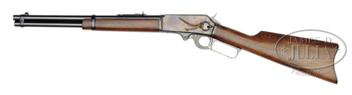 *MARLIN MODEL 93 “TRAPPER” SADDLE RING CARBINE. SN 1087. Cal. 30-30. 16″ bbl with full magazine. Lyman gold bead dove-tail front sight with Rocky Mountain rear sight. Bbl marking forward of the forend band “The Marlin Firearms Corporation./NEW HAVEN. CONN. U.S.A.-PATENTED”. Left side of bbl marked “Special Smokeless Steel”. Cal marking is between receiver and rear sight. Top of receiver is marked “MARLIN SAFETY”. The top tang is marked “Marlin/MODEL 93″SN marked on lower tang. Straight grip stock with curved steel buttplate. Carbine forearm with an overall length 8-1/16”. CONDITION: Excellent. Bbl, magazine, bbl bands, and buttplate retain 98% blue. Receiver retains over 95% brilliant case colors. Lever has 80% striped case colors produced by a cyanide dip method. Buttstock has small chip at the heel. Stock and forend have original finish with light crazing and a few light handling marks. Action has crisp mechanics. Bright shiny bore with crisp rifling. 4-41039 DS29 (3,000-5,000)