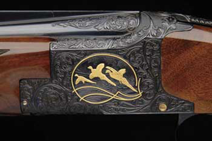 *RARE CASED BROWNING MIDAS LIGHTNING GRADE SUPERPOSED SHOTGUN. Cal. 410. SN 2030J7. Beautiful over/under Browning with 26-3/8″ bbls, narrow hand matted rib with dbl ivory beads, ejectors & gold-plated sgl selective trigger. Receiver is typically Midas engraved with large vignettes of three raised gold flying pheasants on left side, three raised gold flying ducks on right side & a raised gold quail on bottom, all surrounded by very well executed leaf & vine foliate arabesque patterns with fine punch dot background. Trigger guard & forend iron are engraved to match with an elliptical shaped shield on trigger guard. Top tang has “S”, “O” & “U” in gold. Left vignette is engraver signed “MAGIS”. Mounted with extremely beautiful flame grain walnut with checkered rnd field style forearm & semi-pistol grip stock with short tang & raised side panels with carved spear point, 14″ over orig Browning black composition buttplate. Accompanied by orig gold & black hang tag. Also accompanied by a rnd corner, brown leatherette covered, turquoise felt relined Browning case. Drop at heel: 1-7/8″, drop at comb: 1-1/4″. Weight: 6 lbs. 13.76 oz. CONDITION: Extraordinarily fine. As new, may have been fired but if so very little. Retains virtually all of its bright orig factory finish to both metal & wood with no discernible flaws. Checkering has no hand oil indicating virtually no handling. Crisp mechanics, bright shiny bores. Case is fine. 4-55520 JR161 (10,000-15,000)