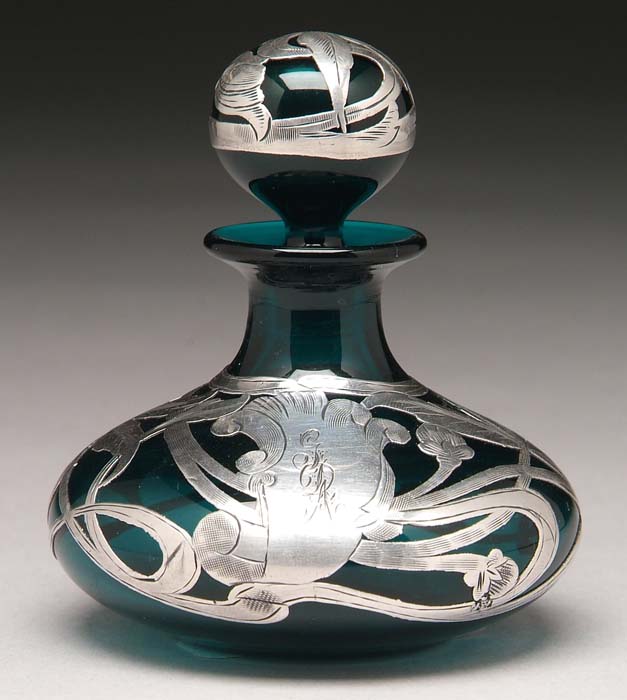 STERLING OVERLAY EMERALD GREEN GLASS PERFUME BOTTLE. The squat shaped bottle having ball stopper all overlaid with floral sterling silver. The silver marked “sterling” (probably by Alvin Silver Company). Monogrammed. SIZE: 3-1/2” h. CONDITION: Very good. 9-73115 (500-700)