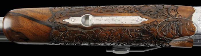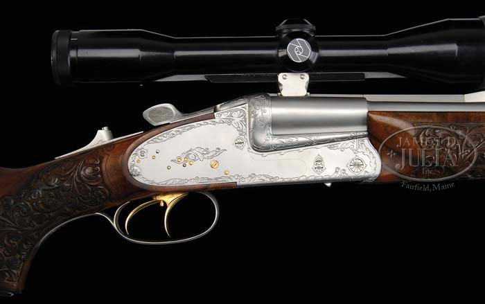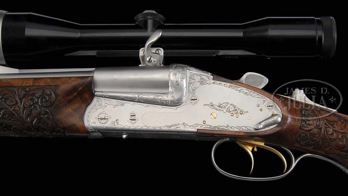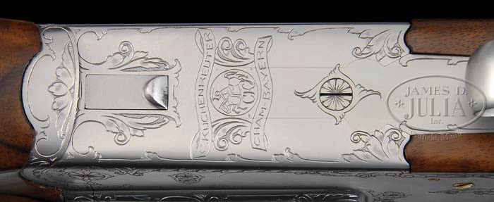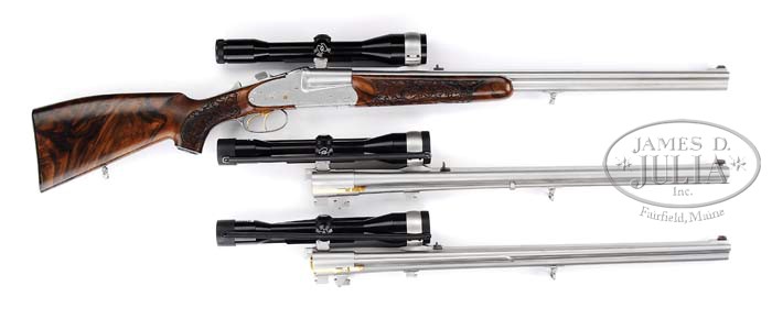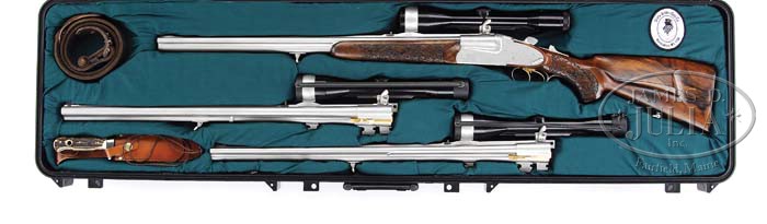 *FINELY CRAFTED KUCHENREUTER SIDELOCK EJECTOR DRILLING WITH THREE SETS OF BARRELS EACH WITH ZEISS SCOPES, WITH KNIFE AND CASE. SN 6349. Cal. 7 x 65 Double Rifle over 20 Ga. (Set 1), 7 x 65 R x 22 Long Rifle over 20 Ga. (Set 2), and Standard Drilling 20 x 20 over 7 x 65 R (Set 3). All barrel sets are 25-1/4″ long with Zeiss Diatal Z 6 X 42 rail mount scopes in pivoting bases, and are engraved “A. Kuchenreuter/ Cham” on top ribs. Bbls are finished in satin chrome with gold-plated extractor lugs. Rear sights are single standing leaf dovetailed through rib. Front sights are gold sourdough blades, longitudinally dovetailed into front raised portion of rib. Sling loop is soldered to bottom of each bbl set. All bbls are stamped “Bohler Super Blitz”, as well as with calibers, and SNs. Importers mark “LWPT Inc. CMG. Ga” is on left side of bottom bbls at breech. Double rifle bbls are fitted with well executed fillers so that same forend can be used on all barrel sets. Back action side lock receiver features cross bolt third fastener, reinforcing bolsters, bushed strikers, tang mounted bottom bbl cocking slide, pivoting safety lever rear of left lockplate, double triggers (front trigger set), and gold-plated cocking hooks, pin ends, and triggers. Satin chrome action and lockplates are nicely border engraved with acanthus and scroll with stippled background. Bottom of action has matching scroll with “C. Kuchenreuter” and “Cham – Bayern” engraved in ribands on either side of horseman logo. Finely marbled, and slightly stump figured European walnut full pistol grip buttstock ends in a ribbed horn buttplate, and features nicely sculpted right hand Bavarian cheekpiece, hogback comb, horn grip cap, and sling loop on toe line. In place of checkering there is an area of very nicely carved acanthus and scroll with stippled background to match theme of action. Rounded semi-beavertail forend has a Deeley release with carving and engraving to match buttstock. Ejector internals are gold-plated. Barrel set no. 1: Bore diameter: bottom -..667 Bore restrictions: bottom -.025. Wall thickness: bottom -.033. Drop at heel: Approx 2-5/8″, drop at comb: 1-5/8″. Weight: 10 lbs. 11.8 oz, LOP 14-1/8″. Barrel set 2: Bore diameter: bottom -.669. Bore restrictions: bottom -.028. Wall thickness: bottom -.033. Weight: 9 lbs. 15.7 oz. Barrel set no. 3: Bore diameter: left -.664, right -.667. Bore restrictions: left -.022, right -.020. Wall thickness: left -.037, right -.036. Weight: 8 lbs. 13 oz. All measurements were made without scopes. Zeiss scopes have heavy three post reticles. Mounts have push forward releases with locking detents on left side. Starlight Pelican type ABS case has compartments for gun and barrels, and is lined with green cloth, with black and white embroidered patch for State Arms Gun Co. Waunakee, WI, and contains Hubertus Solingen clip point Bowie type knife with stag handle, and leather sheath, and a foam backed dark green cloth rifle sling with leather accents. CONDITION: Excellent, near new, showing little evidence of use, except for a few minor marks and abrasions. Action is tight. Ejectors are in time. All bores are excellent. Scopes are excellent. Case is excellent. Knife is as new. This fine custom made ensemble, using only the best accessories, was made to have one gun suitable for almost any purpose, probably never to be replicated. 4-39183 MGM63 (20,000-30,000)
